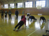 学習発表会が行われた日の午後、教員研修を行いました。体育科の時間に行う体力向上プログラムの内容提案と実地練習です。昼食をとったばかりで、さすがに大変でしたが……がんばりました。