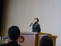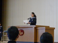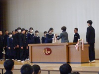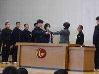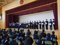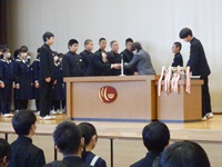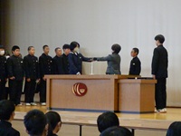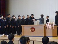 生徒全員が頑張った2学期でした。3年生。最高学年らしくなってきました。2年生。次は僕たちの番だぞという雰囲気を感じることができました。1年生。先輩のいいところを全部吸収しています。もっと自分の良さに自信を持ってほしいです。通信表について。自分がどれだけ取り組んできたのか、結果をしっかり受け止めてほしい。親にありがとうの言える三中生であってほしい。3学期はまとめの時期といわれるが、0学期でもある。次の目標に向かって進めてほしい。以上が校長先生の式辞です。