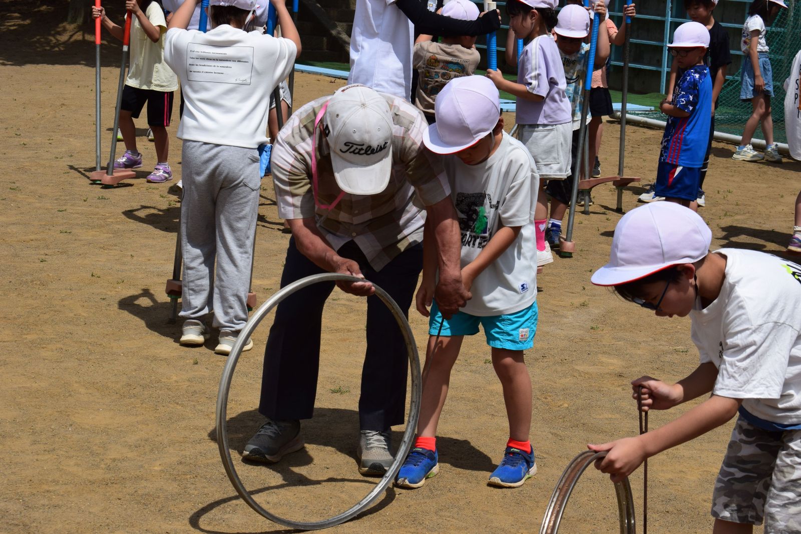 全校縦割り班で活動する「ふれあいタイム」、1年生から6年生までの児童が集まって一緒に活動します。6月からは、地域の方をゲストティーチャーにお招きし、竹馬やたが回し、けん玉、お手玉、あやとりなど、コツを教えていただきながら、いきいきと活動しています。昔の遊びのほかにも、郷土かるたや読み聞かせなど、楽しい活動を通して交流を深めています。交流活動により、児童の社会性やコミュニケーション能力が培われています。