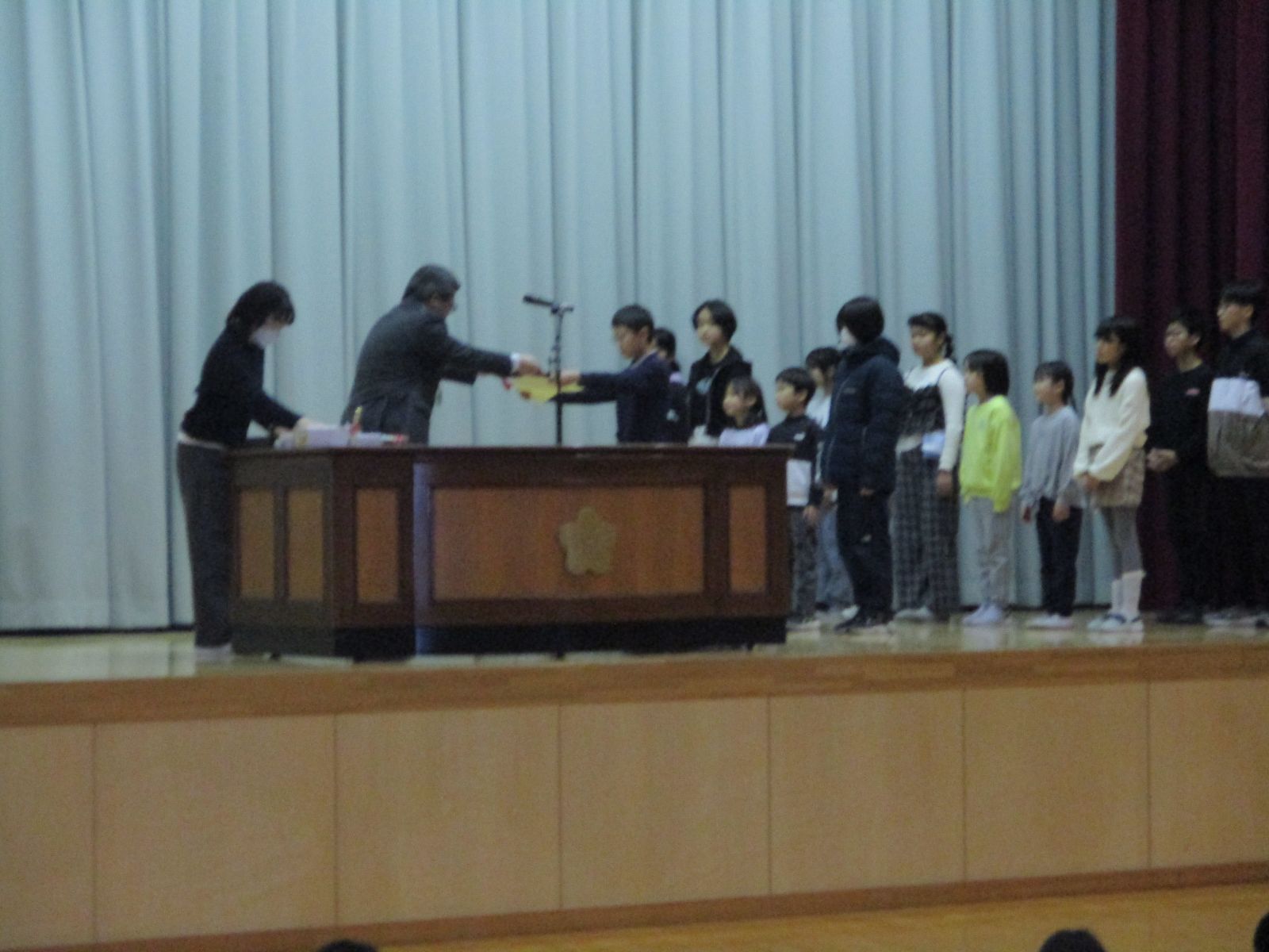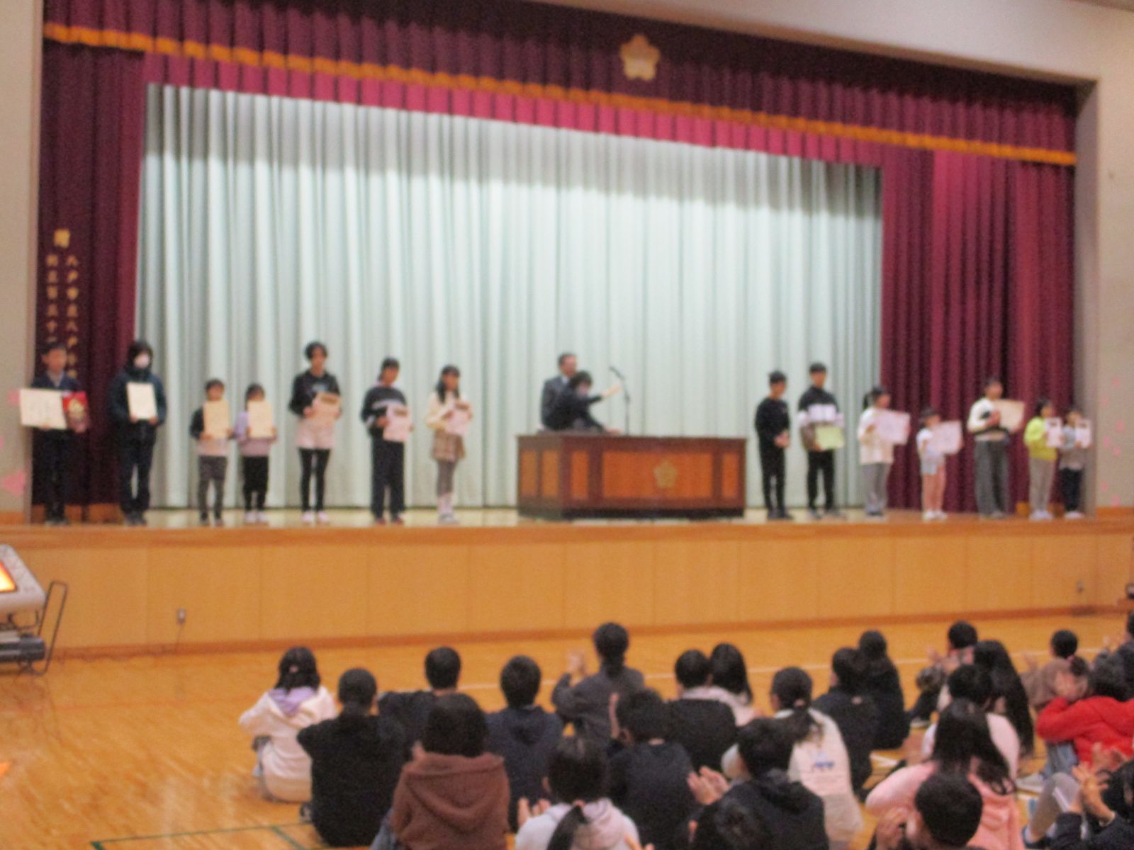 11月18日(火)、全校朝会で賞状伝達を行いました。今日は、第54回八戸市児童生徒発明工夫展NHK青森放送局長賞、他3名、第36回MOA美術館児童作品展5名、社会科自由研究作品コンクール最優秀賞、第48回JA共済青森県小・中学校交通安全ポスターコンクール2名、第6回ドリームチャレンジ杯八戸男子ミニバス愛好会2名の計14名を表彰しました。おめでとうございます。