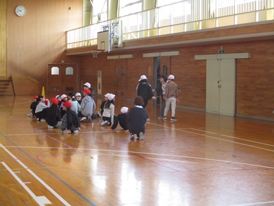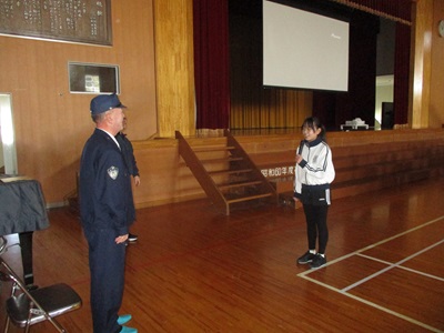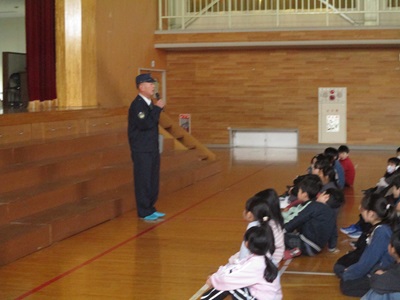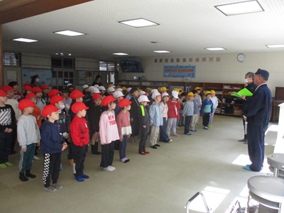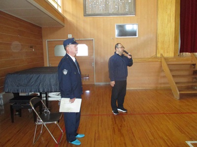 最初は、ホールで白銀交番の所長さんのお話を聞きました。また、今日、お手伝いに来てくれた地域の安全協会のみなさまにもあいさつをしました。