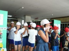 1階家庭科室から火災が発生した想定で避難訓練が行われました。ハンカチを口に当てて煙を吸い込まないように意識しながら、防火扉をくぐって外へ避難しました。