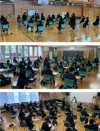 写真上は1年1組(体育館)です。学活の授業で、学級の係を決めています。