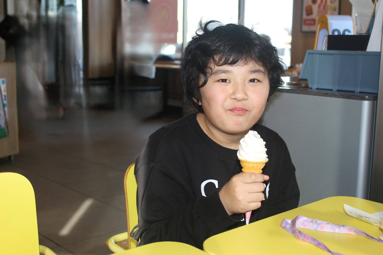 八戸市役所の10階から八戸市の景色を見学した後は、昼食です。マクドナルドかミスタードーナッツ、自分が行きたいお店を選びました。とっても美味しそうに食べています。
