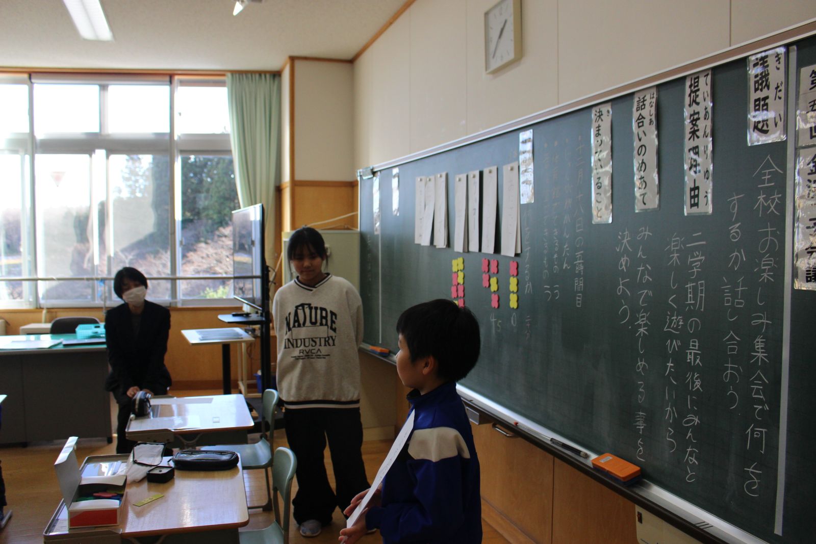 12月5日(金)、参観日が行われました。今回の授業は全校での活動、金浜っ子会議です。議題は「お楽しみ会の計画をしよう」です。司会は、4・6年生です。二人で協力しながら進めています。