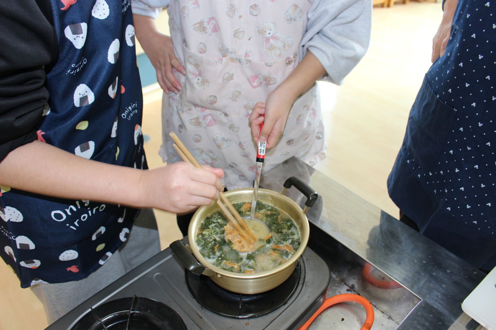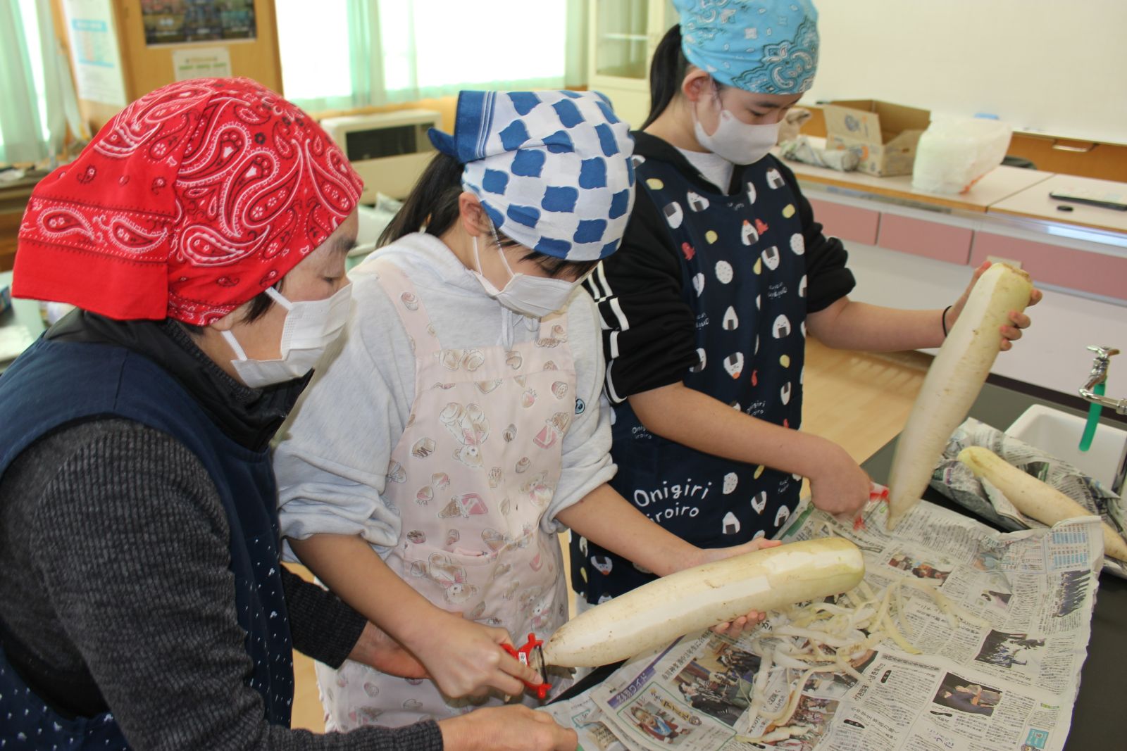 干し菜を活用した味噌汁や漬物作りを通して、保存できるように工夫することで、食品ロスの削減につながることを学ぶことができました。ゲストティーチャーの方からは、優しくそして丁寧に作り方を教えていただきました。子どもたちにとっても先生方にとっても「大先生」です。どうもありがとうございました。