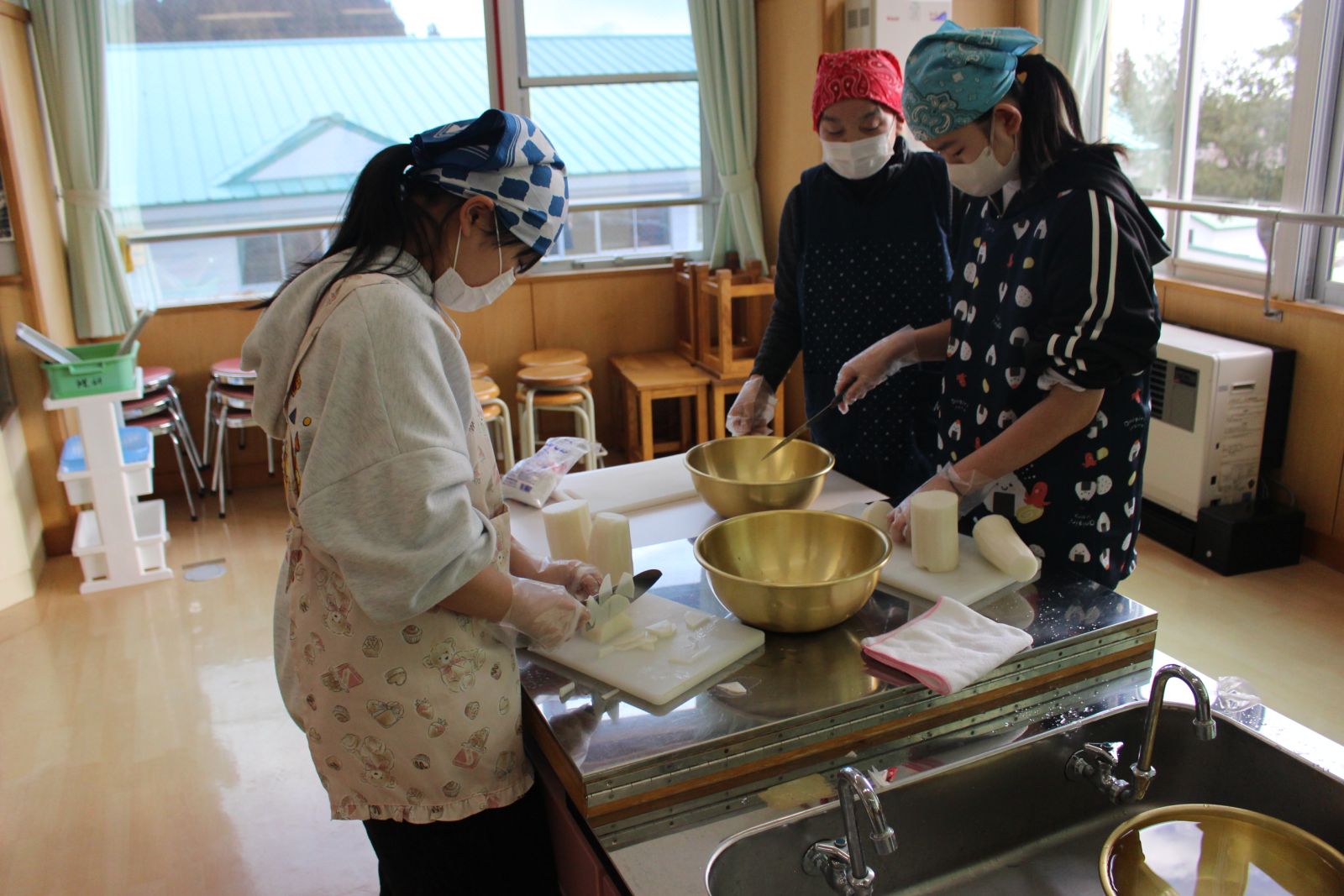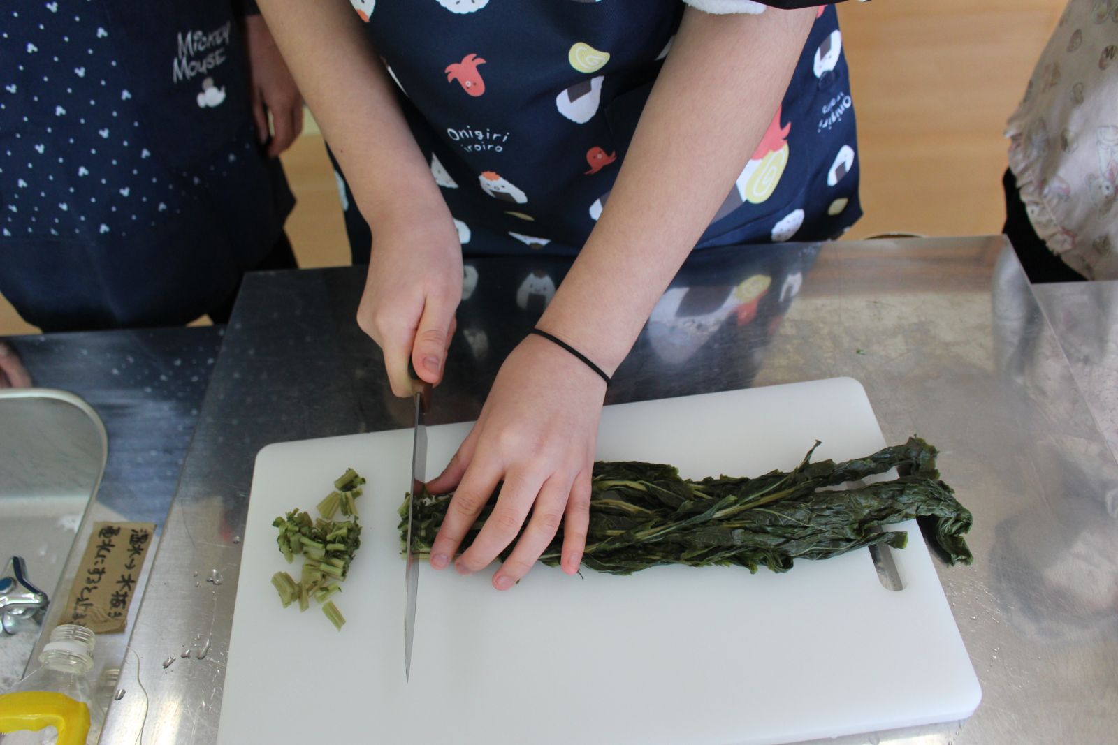 次は、大根の葉を干して、ゆでたものを切っています。(大根や干し菜は、地域の方からいただきました。ありがとうございます)