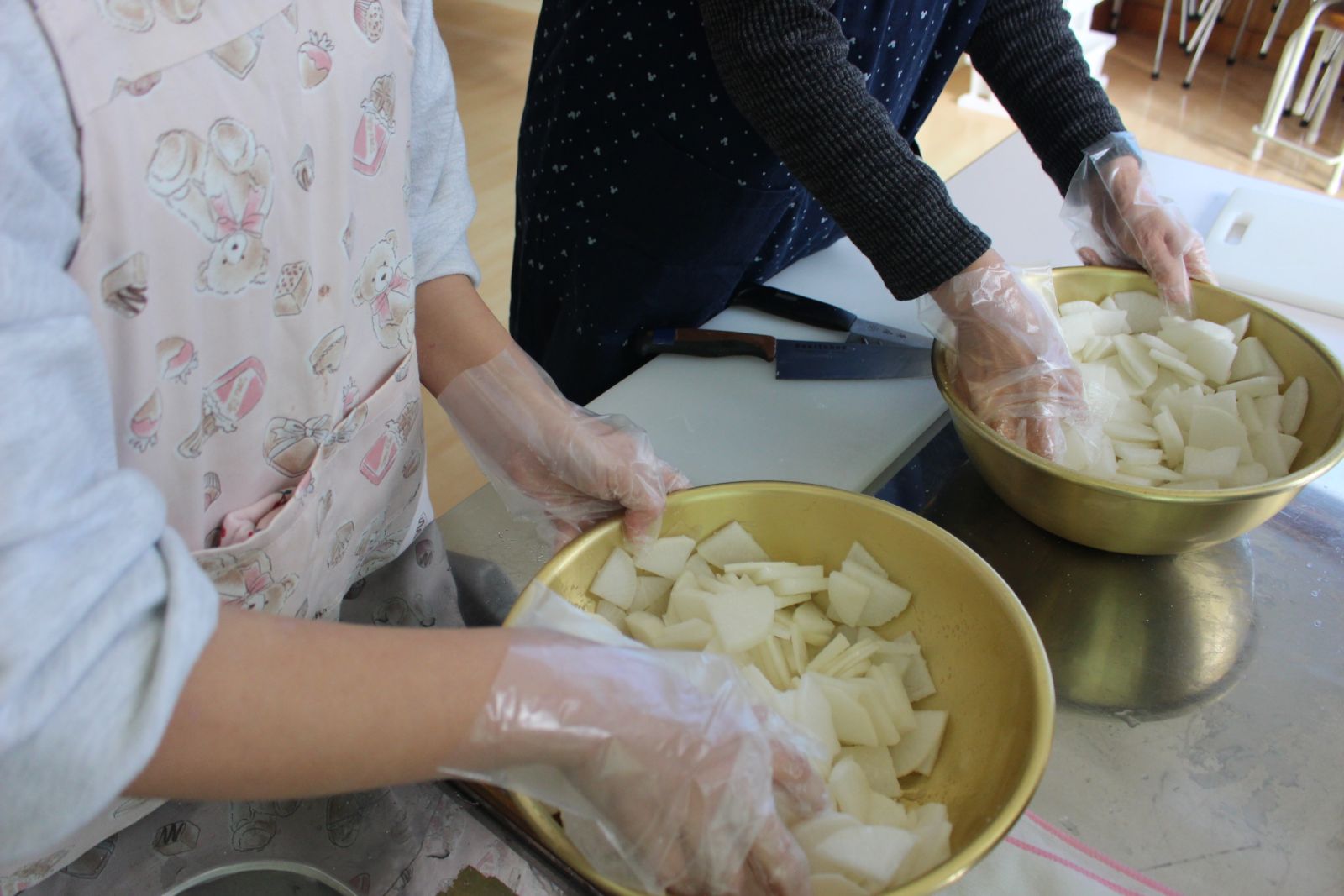 大根に塩を入れたものは、一晩寝かせて酢・三温糖混ぜ、3日ほど置いたら漬物の完成です。食べることができる日がとっても待ち遠しいです。