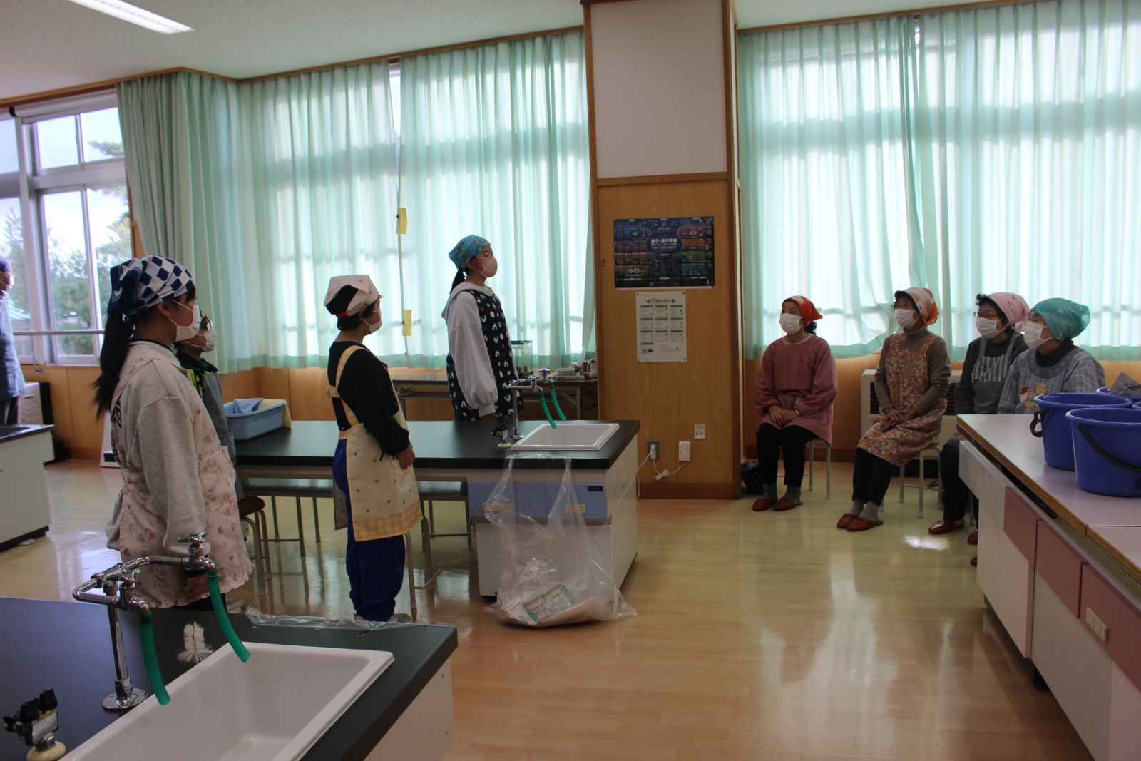 みんなで協力して皮をむいた柿は、お湯の中に入れます。担当は6年生です。さすが6年生、手際がよい!