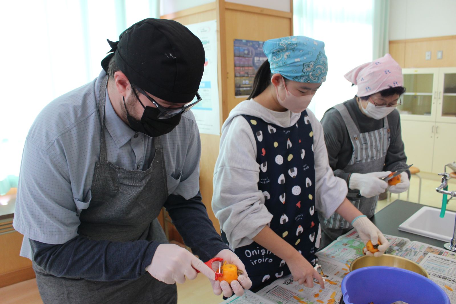 ALTの先生も一緒に柿の皮をむいています。皮をむいてもむいても柿は、まだまだたくさんあります。
