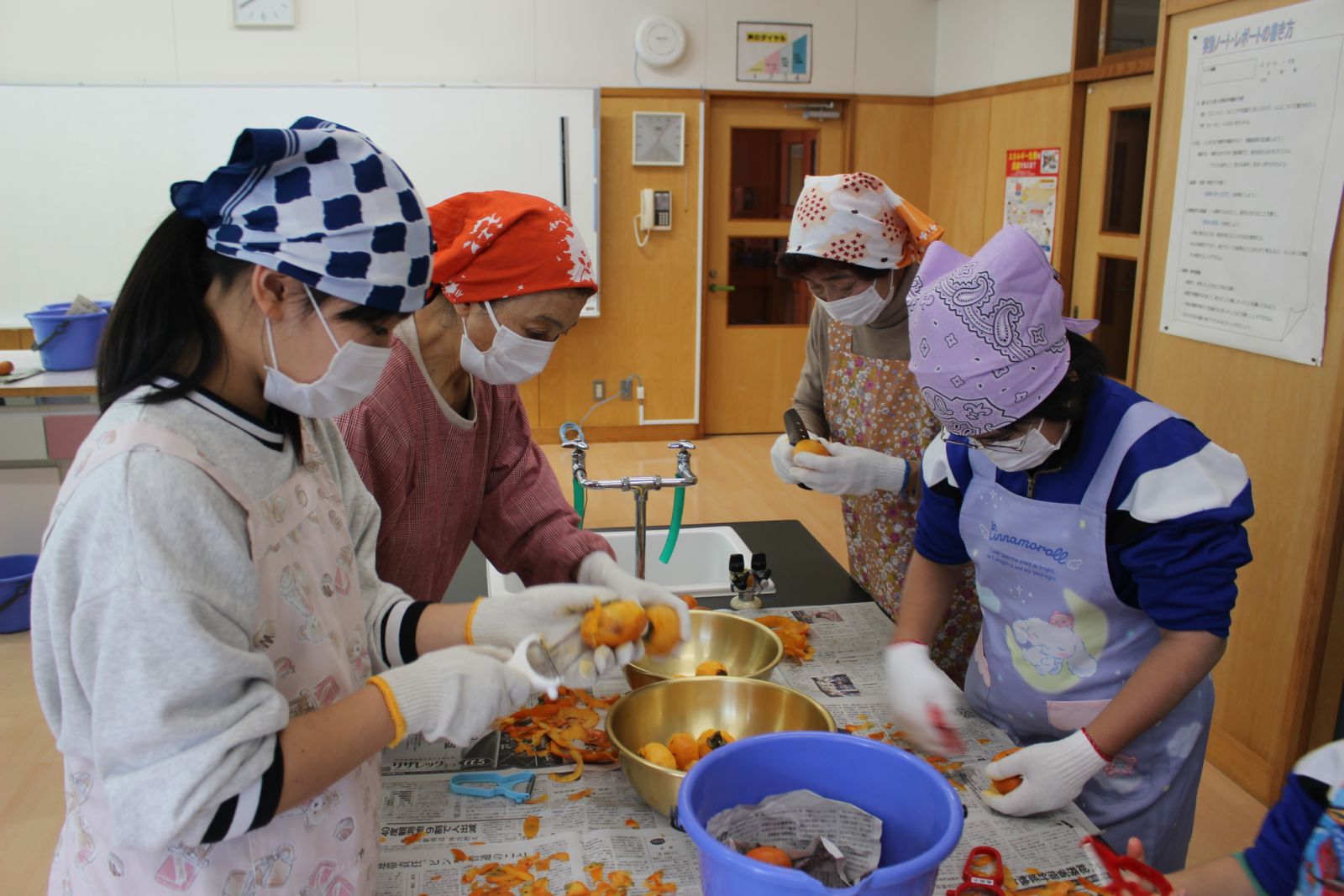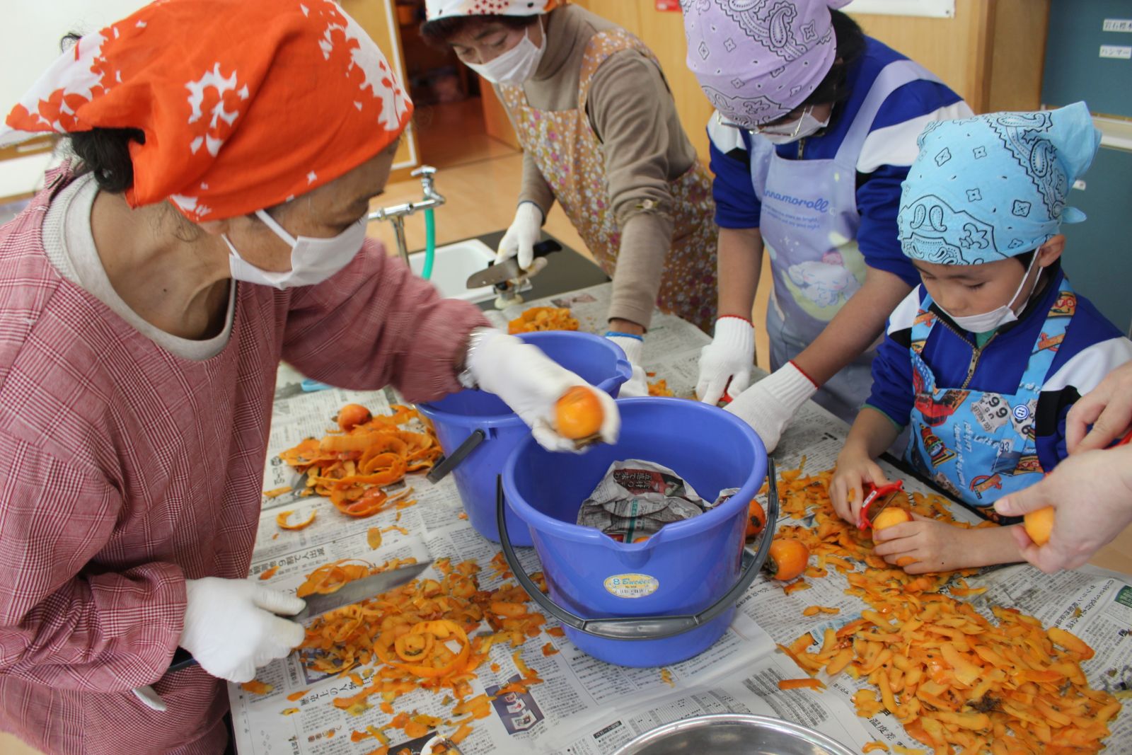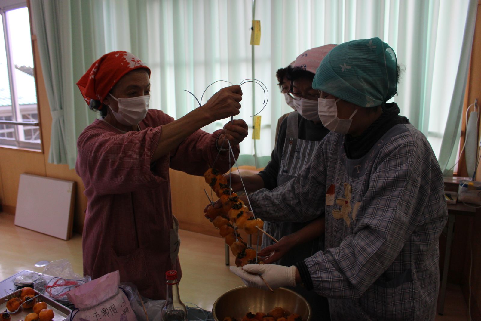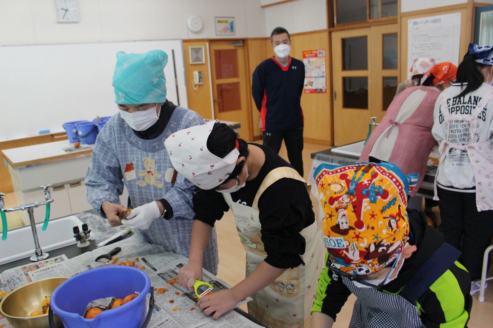 11月28日(金)、干し柿作りを行いました。先日、地域の方所有の柿の木から、子どもたちが柿狩りをさせていただきました。その柿を使わせていただき、干し柿作りに挑戦です。当日、地域の方4名がお手伝いをしてくださいました。「よろしくお願いします!」元気な挨拶からスタートです。