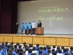 4月22日(金) 八戸警察署類家交番の所長さん、交通安全協会柏崎支部や交通指導隊柏崎支隊、そしてPTA交通安全母の会の方々のご出席のもと、交通少年団の組織会が行われました。柏っ子は全員「交通少年団」の団員です。団旗を受け取ったあと、真剣な表情で、誓いの言葉を述べる柏っ子。地域のたくさんの方々に見守られていることへの感謝の気持ちも高まりました。組織会のあとに行われた「交通安全教室」では、類家交番の所長さんより、道路を渡るときの「止まる、見る、待つ」ことの大切さについて、分かりやすく教えていただきました。