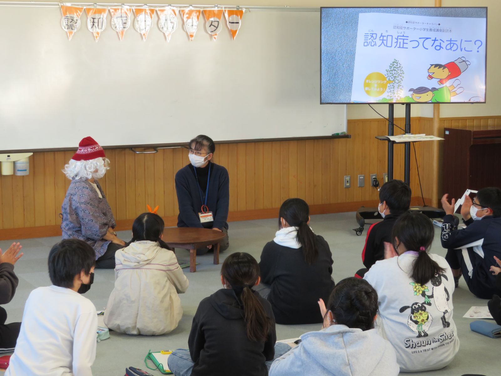12月5日に、八戸市の「こころすこやか財団」の方を招いて、6年生のが認知症の方への適切な接し方を学びました。講師の方は、認知症の方とその家族に見立てた寸劇も披露して、児童は2パターンのやり方を見比べて、当事者に寄り添った対応を考えました。家庭や地域の中で、お年寄りの身になって行動できる「認知症サポーター」を目指します。