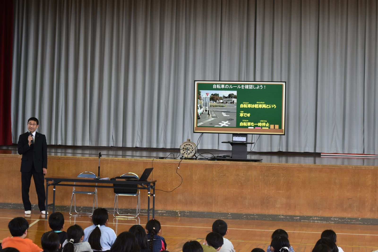 4月10日には、八戸モータースクールの方を講師に、全校で交通安全教室を行いました。自動車からの死角や自転車に乗るときの注意点をスライドを見ながら学びました。ヘルメットの着用については自分の命を守るためにぜひ被るようにしましょうというお話がありました。