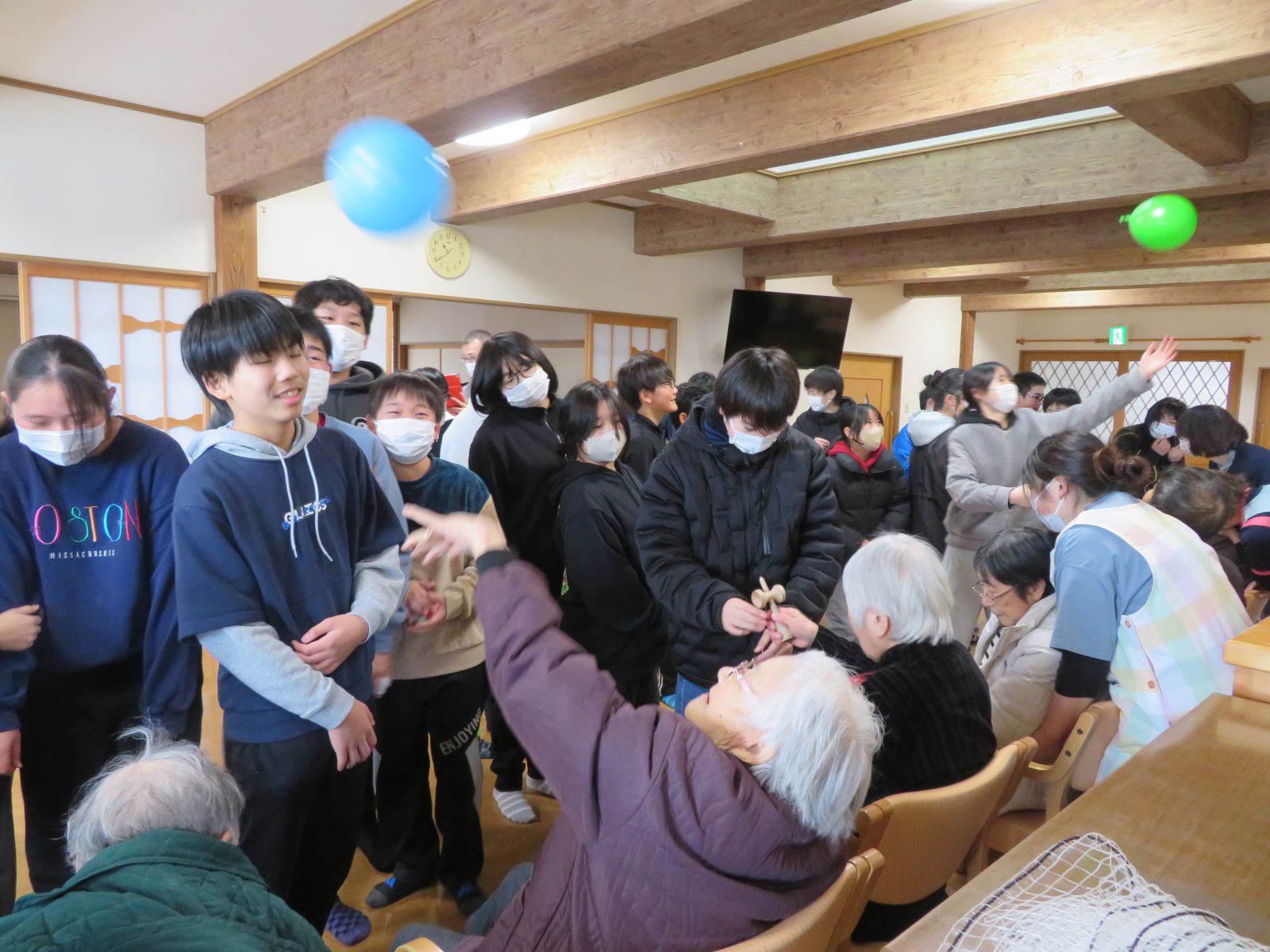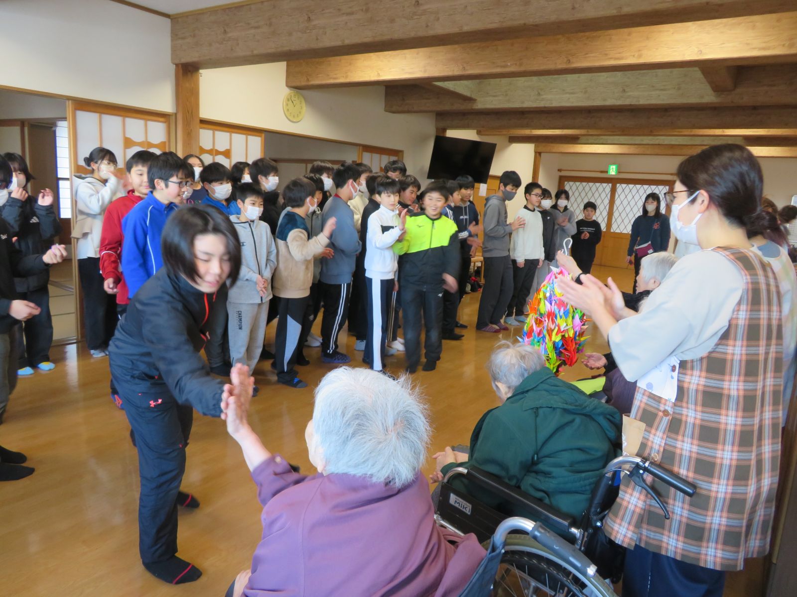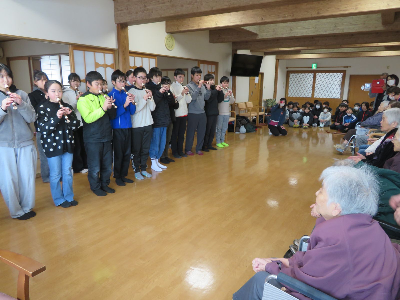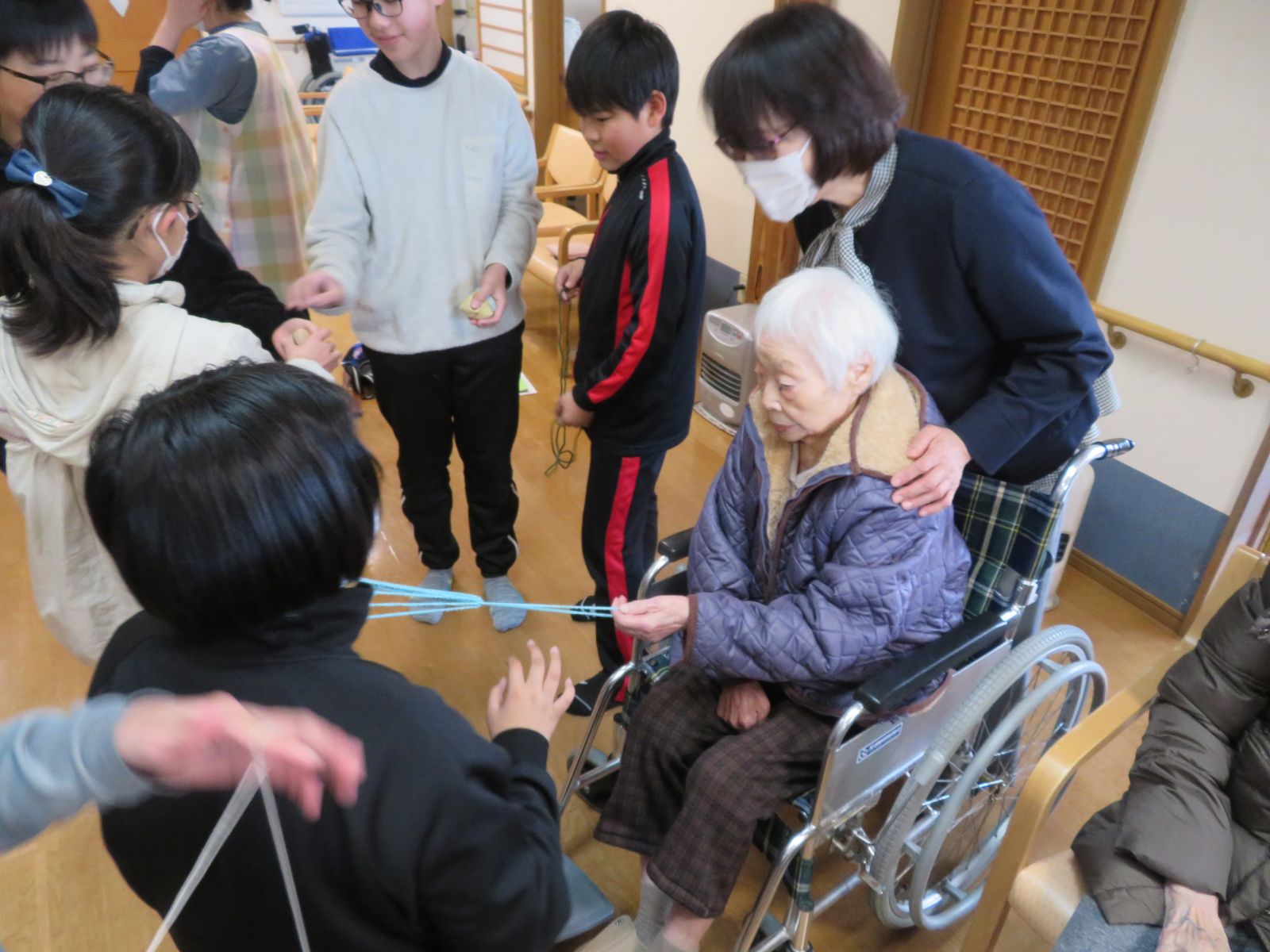 6年生が地域にある指定認知症対応型共同生活介護施設「グループホーム桔梗野の家」を訪問し、お年寄りの方々と交流しました。最初に歌やリコーダー演奏を披露しました。「ふるさと」の笛の音に合わせて、お年寄りの方々が歌ってくださいました。次に、お手玉やあやとりなどの昔の遊びを一緒に楽しみました。子どもたちは12月の「認知症サポーター講座」で学んだことを生かして、目線を合わせてゆっくりと話しかけていました。最後に自分たちが作った千羽鶴をプレゼントしました。お年寄りの方々が笑顔で見送ってくださり、子どもたちも握手をしてお別れをしました。ご協力くださった職員の皆様、ありがとうございました。
