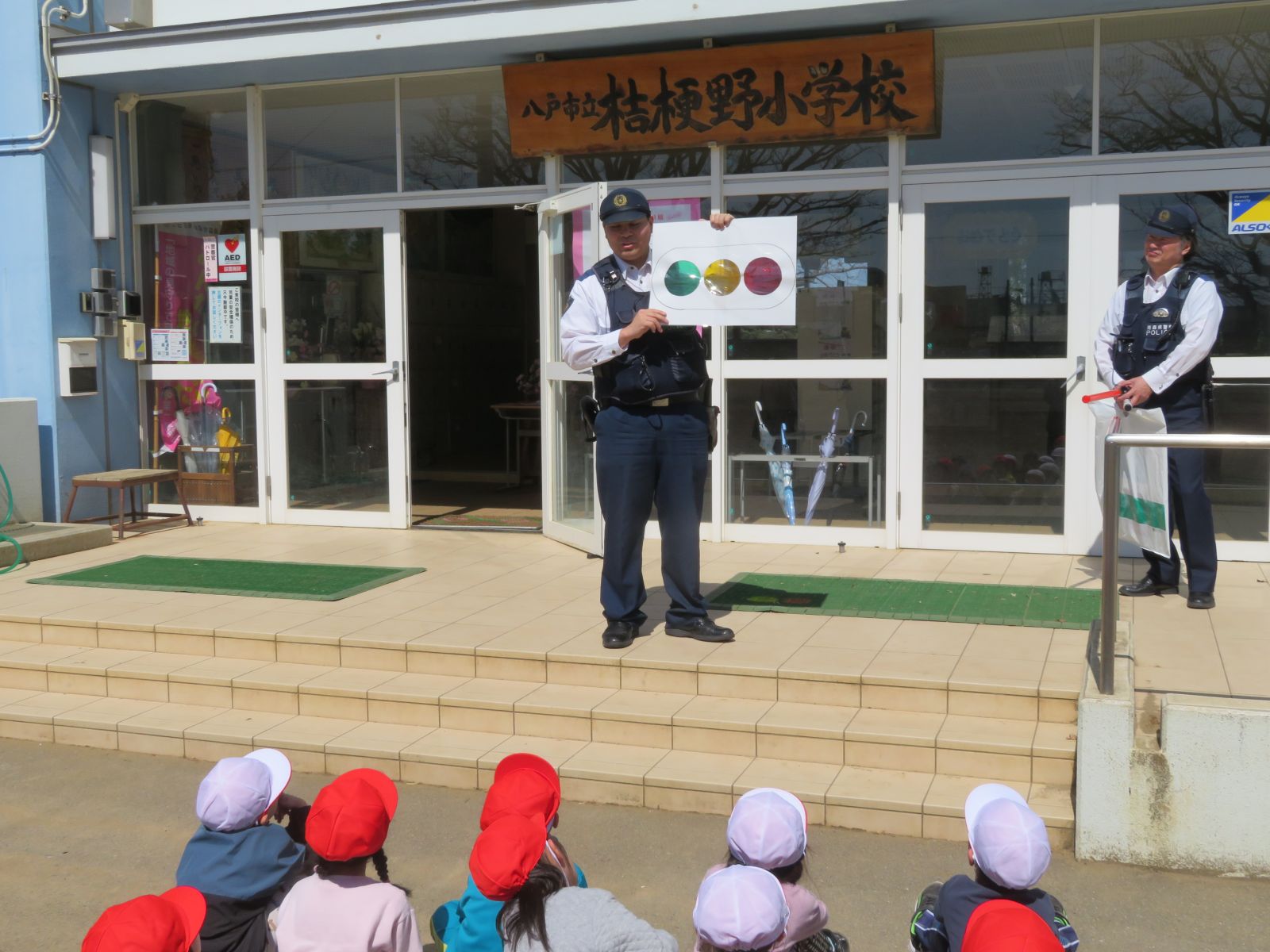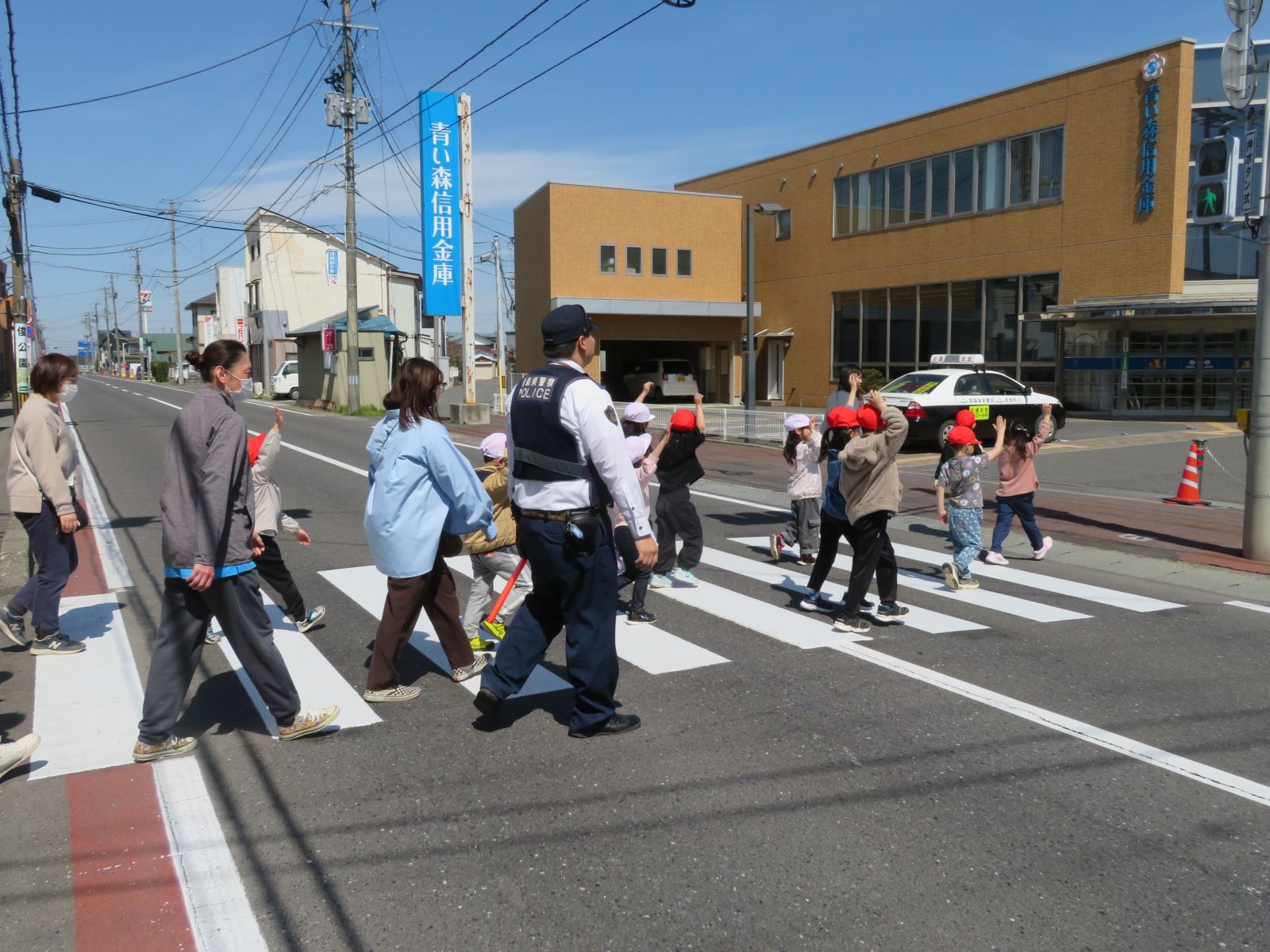 ご協力いただいた、市川駐在所の皆様、交通安全協会市川支部長様、八戸モータースクールの職員の皆様、見守りの保護者の皆様、ありがとうございました。