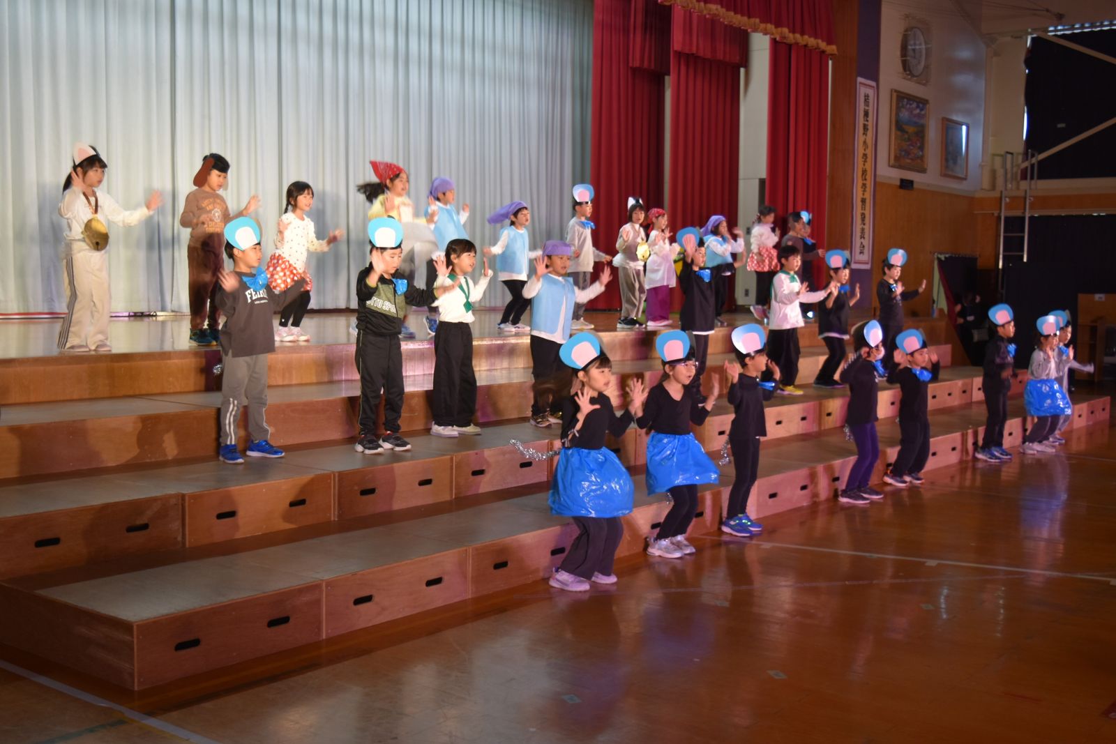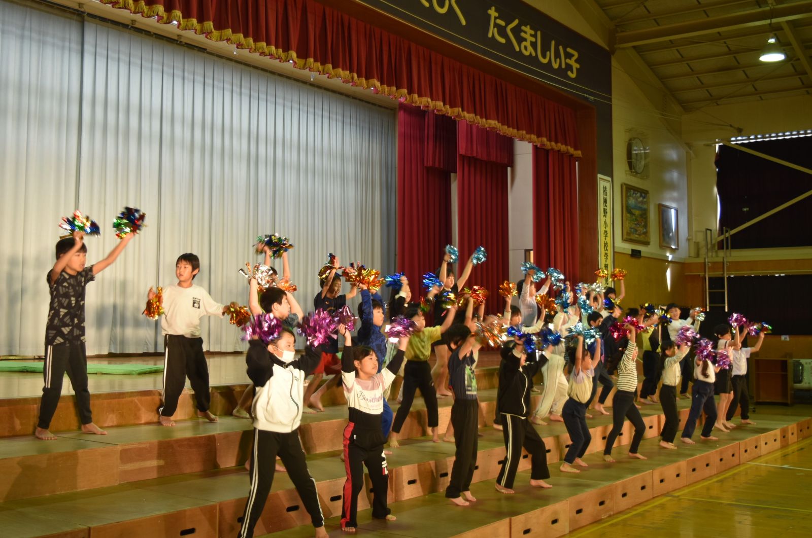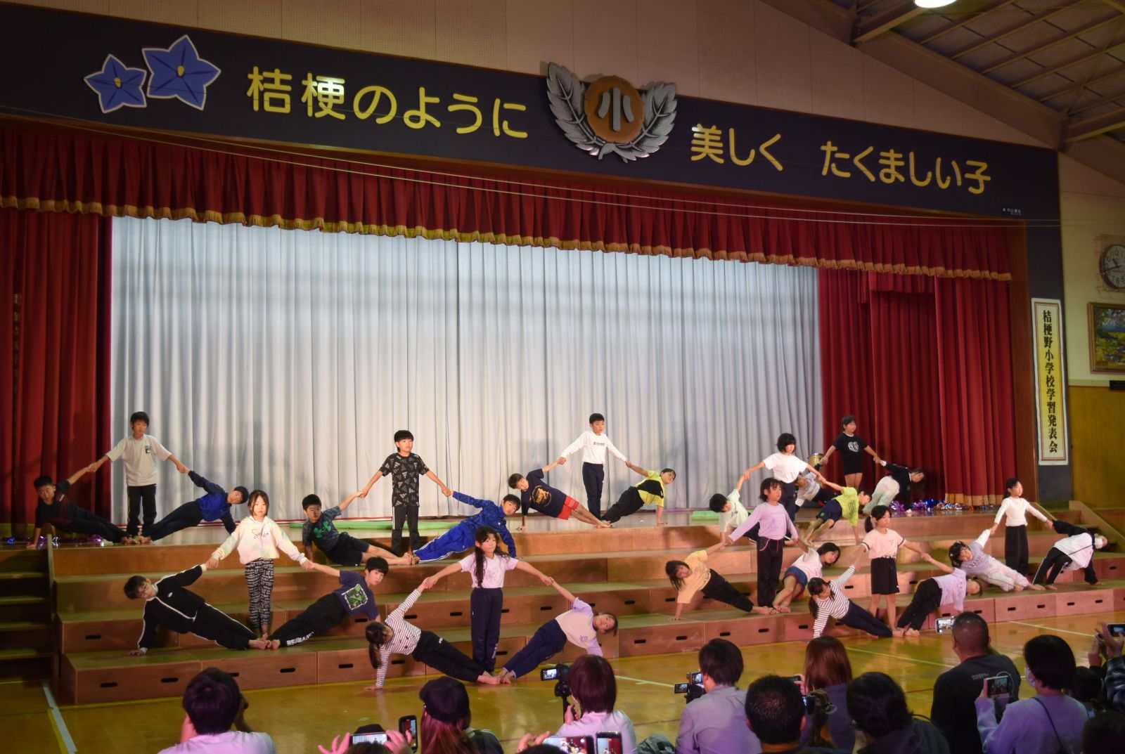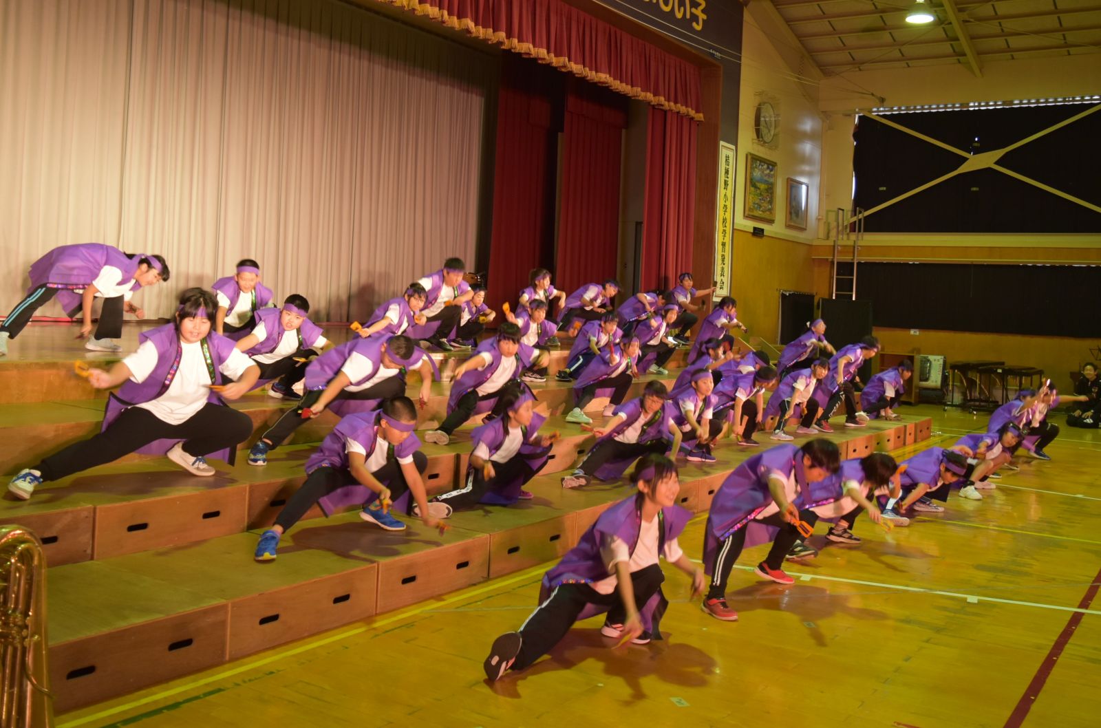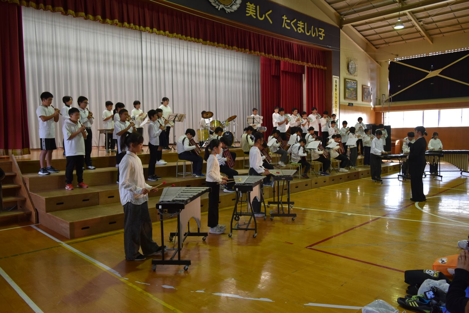 子どもたちは、自分が練習してきた成果を十分に発揮できたことで、大きな満足感を得られたようで、発表を終えてステージから退場するときは、みんな笑顔でお客様の前を通っていきました。前校長先生をはじめ来賓の方々からも大絶賛していただきました。