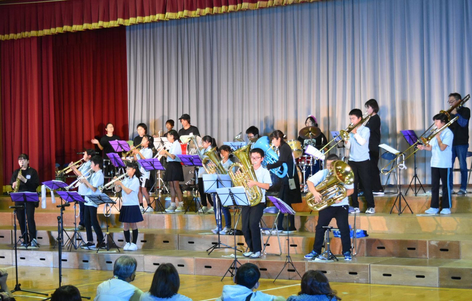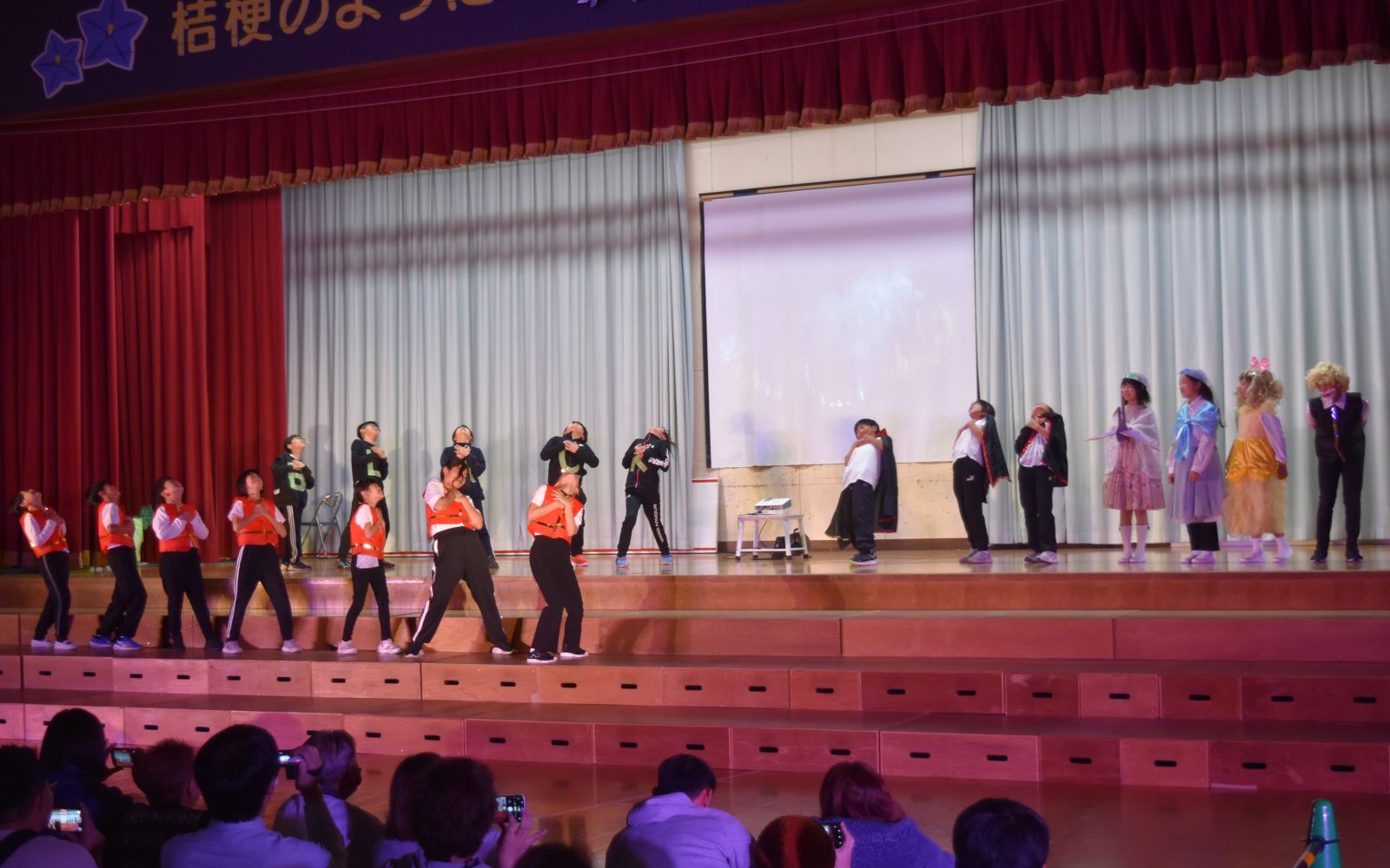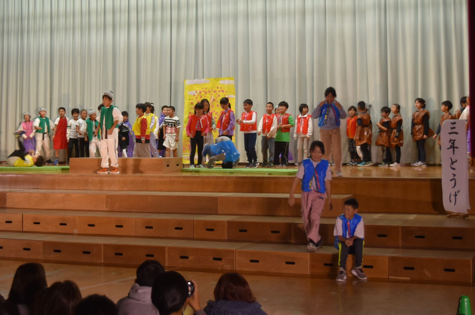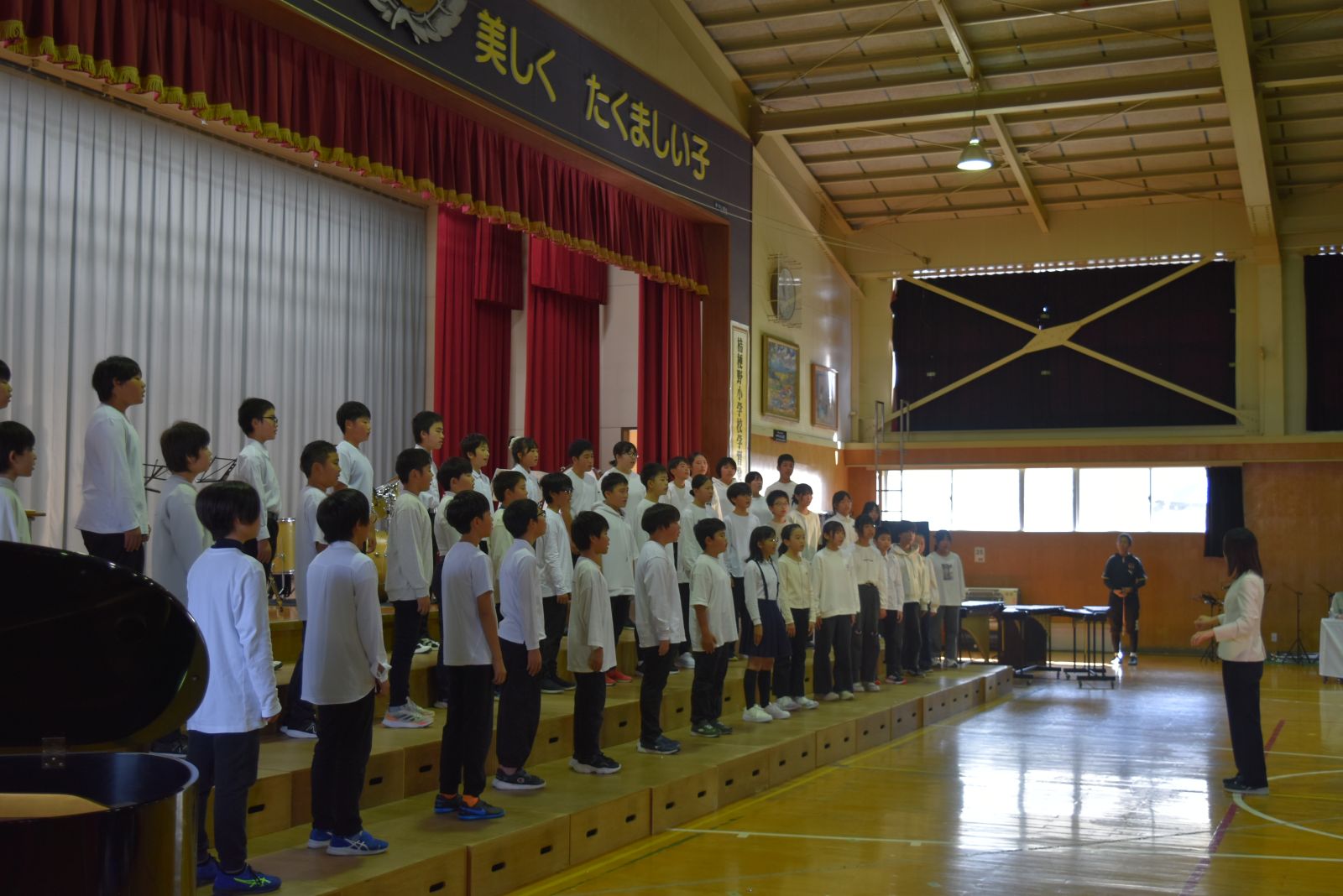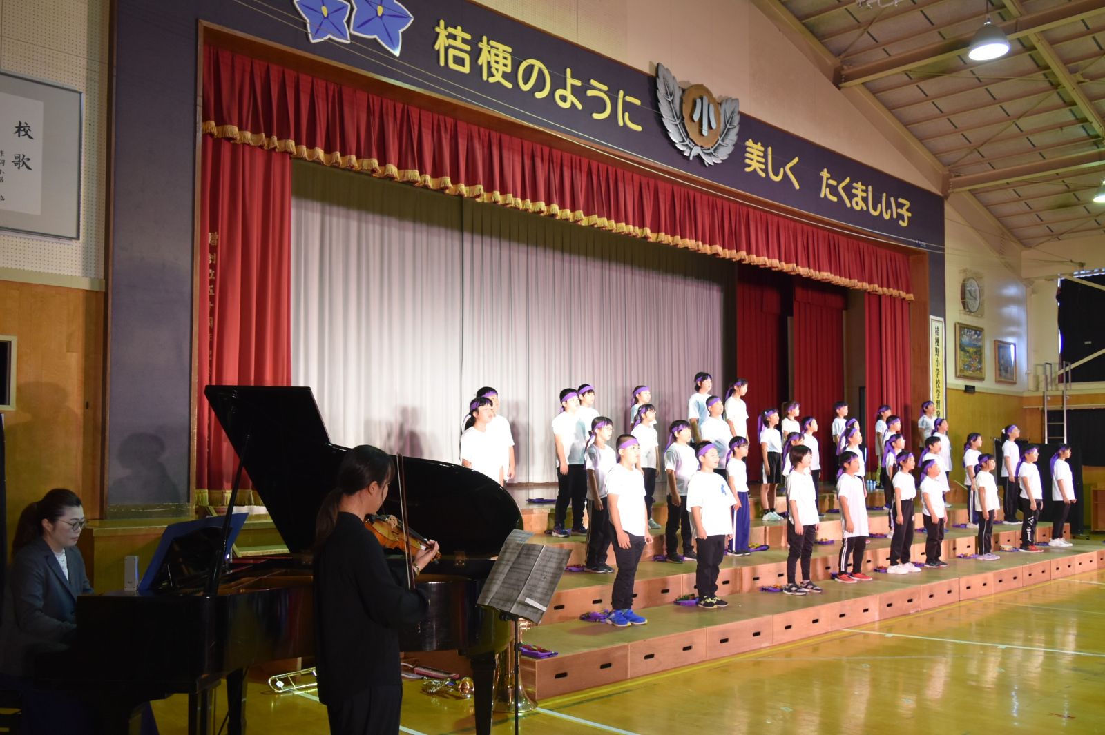 子どもたちは、自分が練習してきた成果を十分に発揮できたことで、大きな満足感を得られたようで、発表を終えてステージから退場するときは、みんな笑顔でお客様の前を通っていきました。前校長先生をはじめ来賓の方々からも大絶賛していただきました。