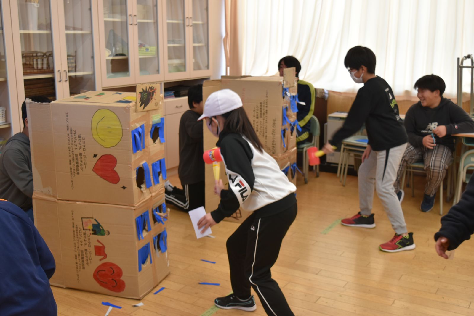 2日目は起床後すぐに自分で布団をたたみましたが、上手くできずに大苦戦しました。そして、青空のももと、グループごとにアドベンチャーゲームに挑戦しました。前日のイカダと同様に、みんなで協力して取り組みました。