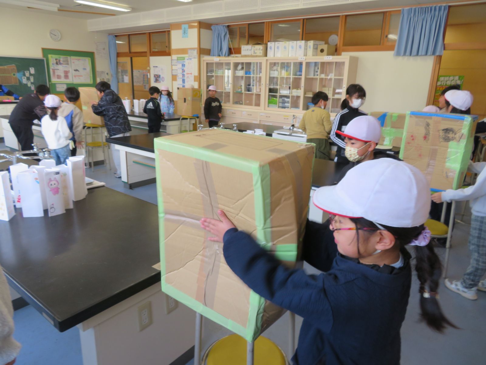 角材と板を組み合わせてひもで結び、さらに大型の発泡スチロールを結びつけて完成です。