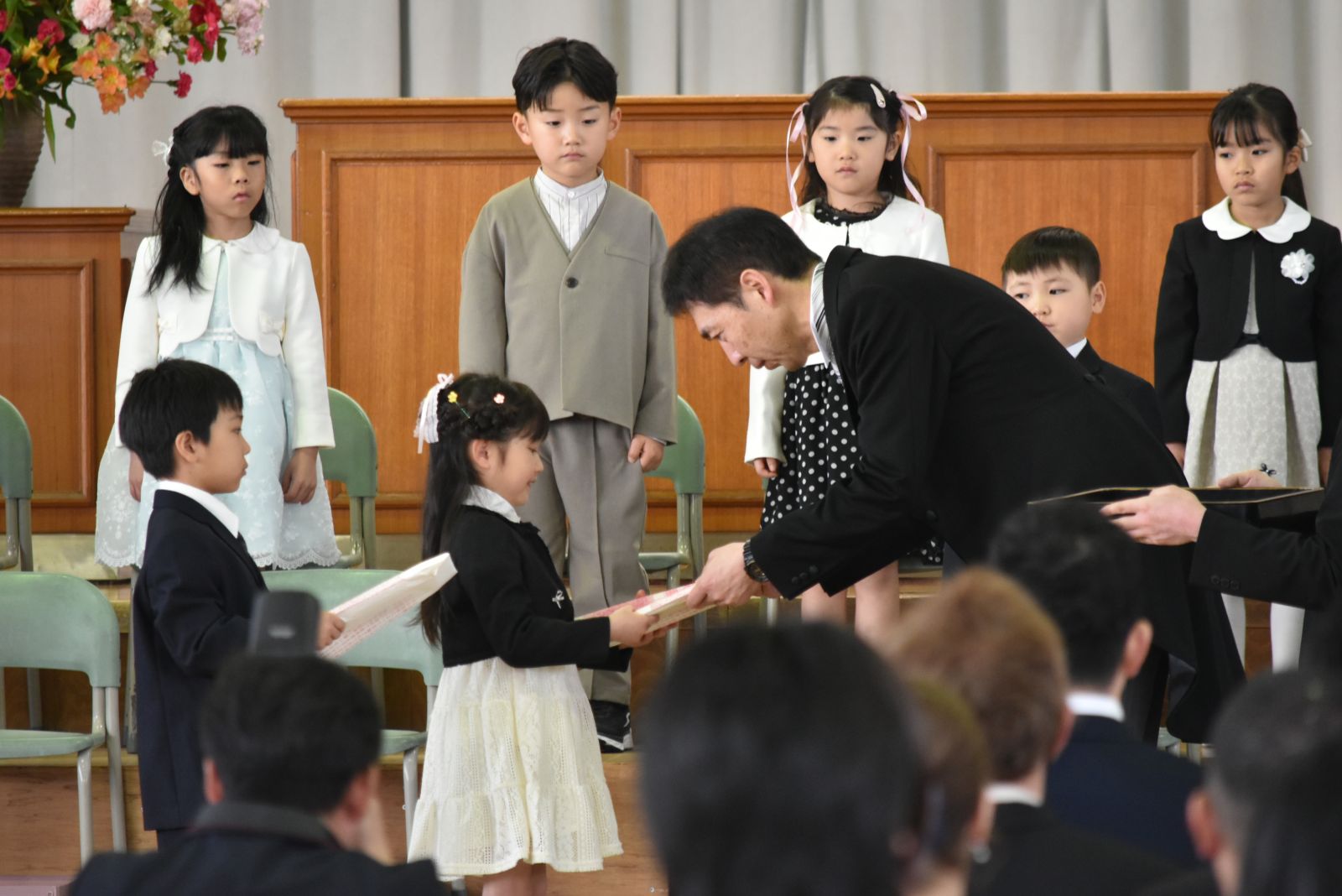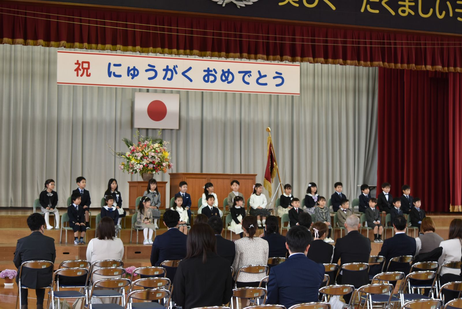 入学式では、来賓・保護者・上級生が見守る中、新入生26名が入場し、担任が一人一人の名前を呼びあげると、少し緊張しながらも、全員がきちんと返事をしました。校長先生から教科書を受け取った代表児童は「いっしょうけんめいべんきょうします。」と元気よくあいさつしました。