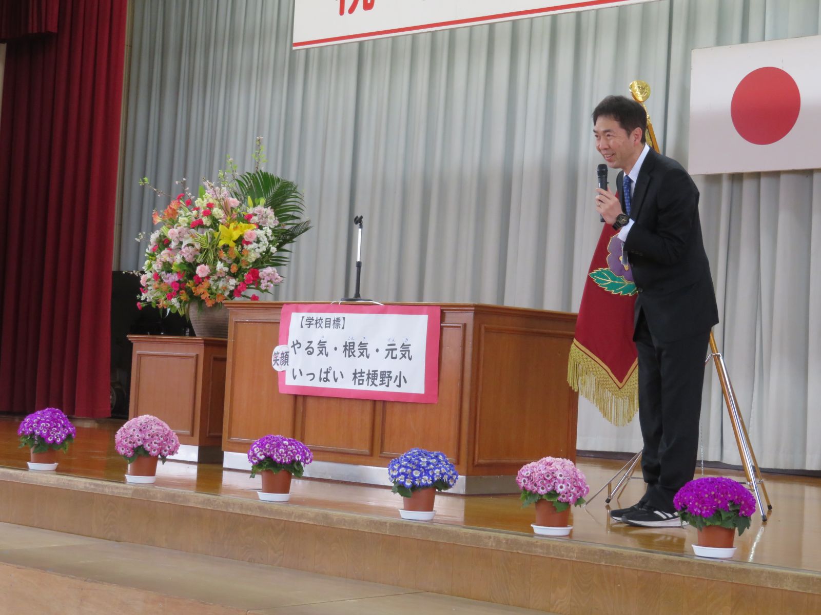 始業式では、今年度の学校目標 『「やる気・根気・元気」笑顔いっぱい 桔梗野小』について校長先生からお話がありました。児童は決意を新たに今年度最初の校歌を大きな声で歌いました。