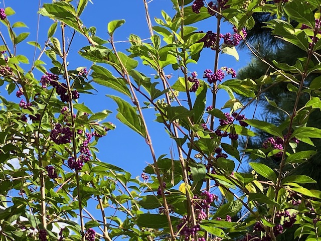 晴れた日、窓越しにムラサキシキブの実の姿が