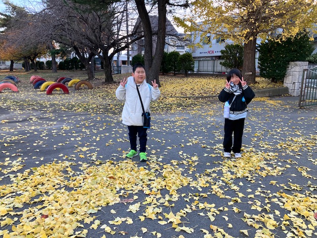の落ち葉がびっしり。朝一番の子とパシャリ。