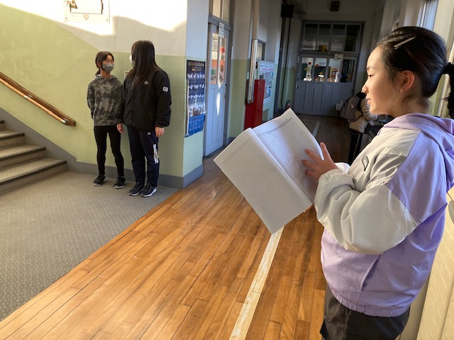 2階階段の前で、笑顔で挨拶のよびかけです。