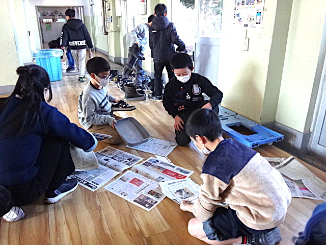 トレーにたまった砂を捨て、新しい新聞紙に。