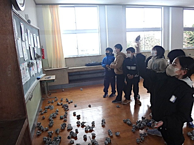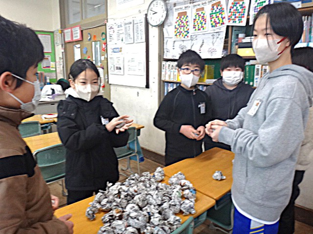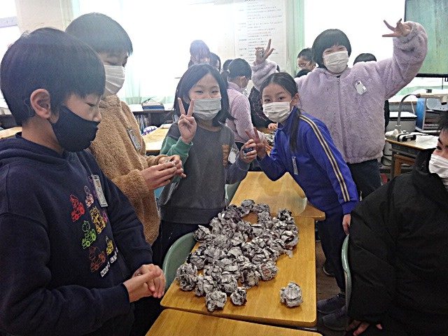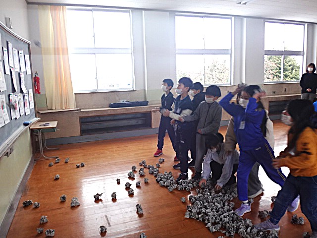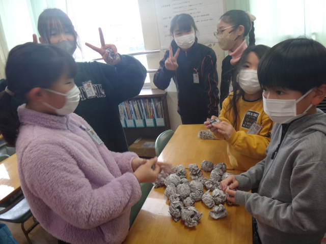 教室では、みんなで新聞を丸めています。