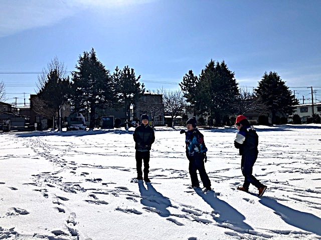 夕べの雪が降り積もった校庭。同じ八戸市内でも、