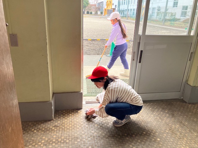 汚れがたまった児童玄関のタイルも