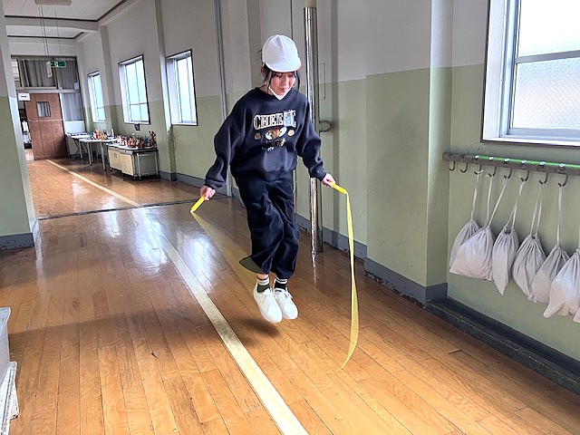 校庭が使えないので、廊下で縄跳びの練習。
