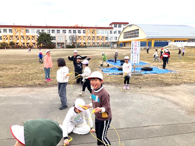 久しぶりに校庭での遊びを楽しむ>