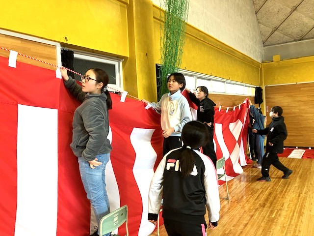 5年生が卒業式の会場準備をしていました。