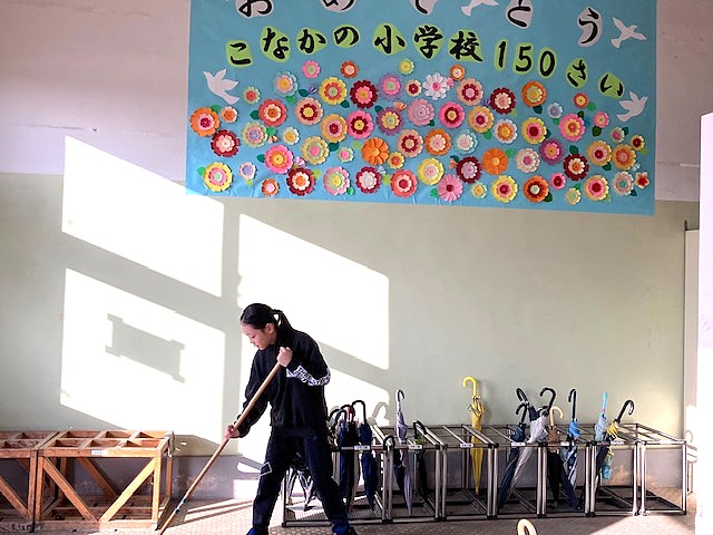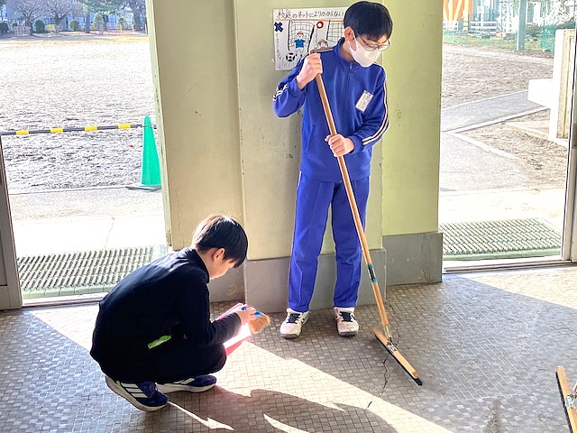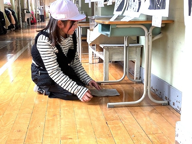 廊下の乾拭き。奥の方まで手を伸ばし、