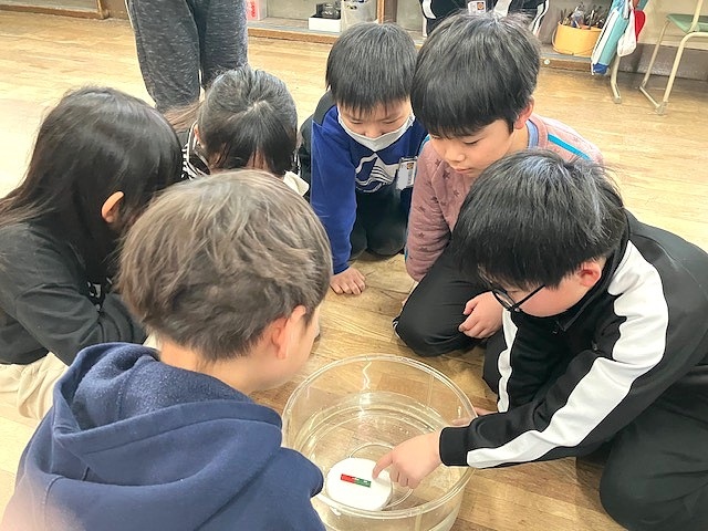 磁石を発泡スチロールに乗せ、水に浮かべて