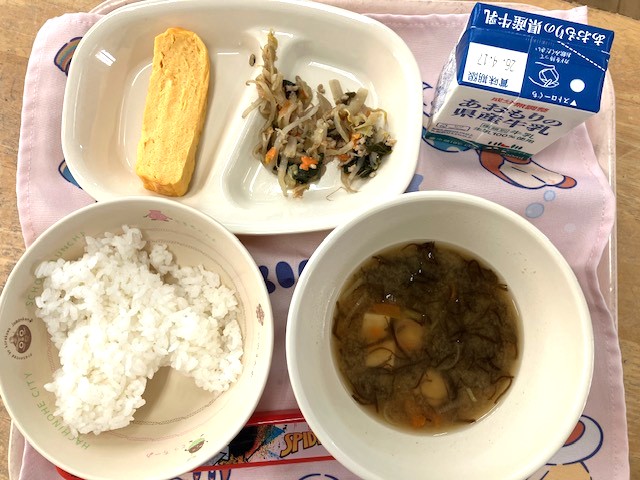 献立は、ご飯・牛乳・もずくの味噌汁・
