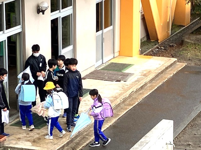 6年生がランドセル拭きに玄関前で待っています。
