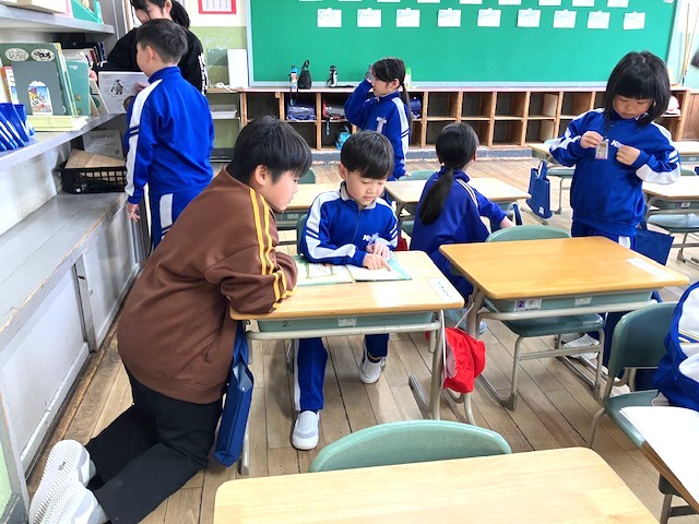 1年生の教室では、6年生のお兄さんに見守られ