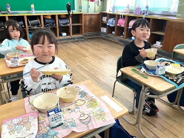 1年生の給食が開始。みんな、「おいしいです!」