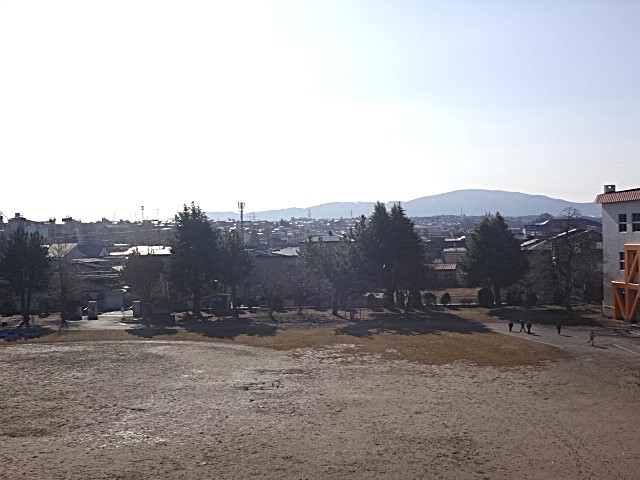 夕べの雪が降り積もった校庭。同じ八戸市内でも、