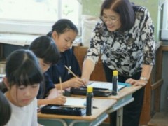 小筆で童謡を楽しそうに書いていました。用紙に対する文字の大きさや配列、童謡で多く使用している「ひらがな」の書き方を教えていただきました。子どもたちは「ひらがな」の美しさを感じていました。