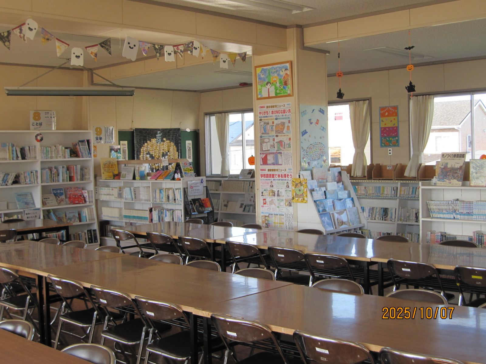 小中野中は毎週火曜日に図書ボランティアの皆様が作業してくださいます。皆様のおかげで、図書室が使いやすく、きれいになっています。今週の作業でハロウィンバージョンになり、楽しく季節感にあふれた図書室になりました。小中野中の図書室の本は地域の皆様にも貸し出しております。毎週火曜日10時から12時まで(祝日、長期休業中はお休みです)おひとり3冊まで2週間以内で貸し出しております。返却は月から金曜日9時から15時まで事務室(玄関から入って右側)です。よい本がそろっていますので、お気軽にご利用ください。
