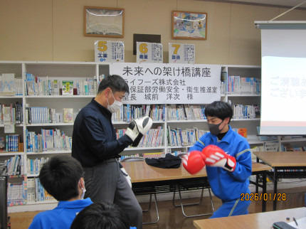 28日(水)今年度第5回目の『未来への架け橋講座』を行いました。講師は、元本校PTA会長で、現在プライムフーズ(株)にお勤めの城前様でした。城前様は、プライムフーズ社が扱っている鶏肉について、担当されている安全管理について丁寧に教えてくださいました。特に、コミュニケーション能力の大切さを生徒に語ってくださいました。最後に、元ボクシング大学全日本チャンピオンの城前様が、希望した生徒にボクシンググラブをつけさせ、パンチを受けてくださいました。