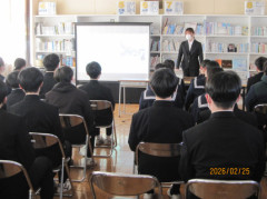 25日(水)本校の卒業生の山形大学4年生のAさんが2年生に対して講演会を行ってくださいました。八戸市奨学生の奉仕活動としての取組でした。内容は、『2回の受験から学んだこと』と高校受験、大学受験に関すること、自分のペースを大切にしながら勉強が楽しくなるように工夫すること、大学生の今でも後悔することはあるが失敗は悪いことばかりではなく、経験から何を学ぶか、次にどうすればよいか考えることが大切、ということをお話ししてくださいました。生徒からの質問では、「受験勉強はいつから始めたらよいですか」や「大学受験と高校受験はどちらが大変ですか」などがありました。感想では、「テスト勉強は早めに始めるようにします」「わからないことは周りの人に教えてもらうなど頼ることも大切にします」などがありました。生徒の皆さんは進路についてや学習について考える良い機会になりました。講演していただきありがとうございました。