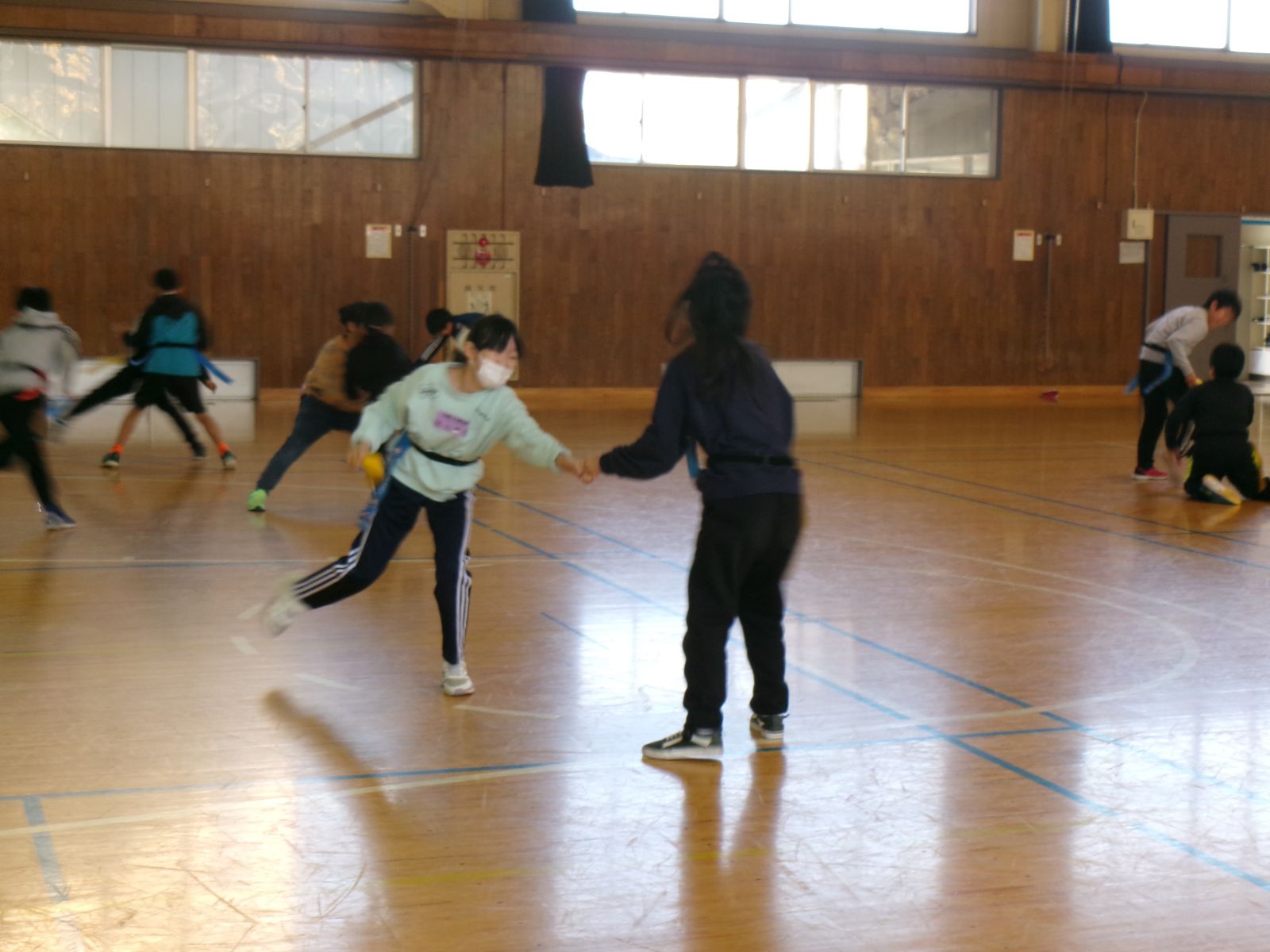 楕円形のボールを上手にパスしていました。