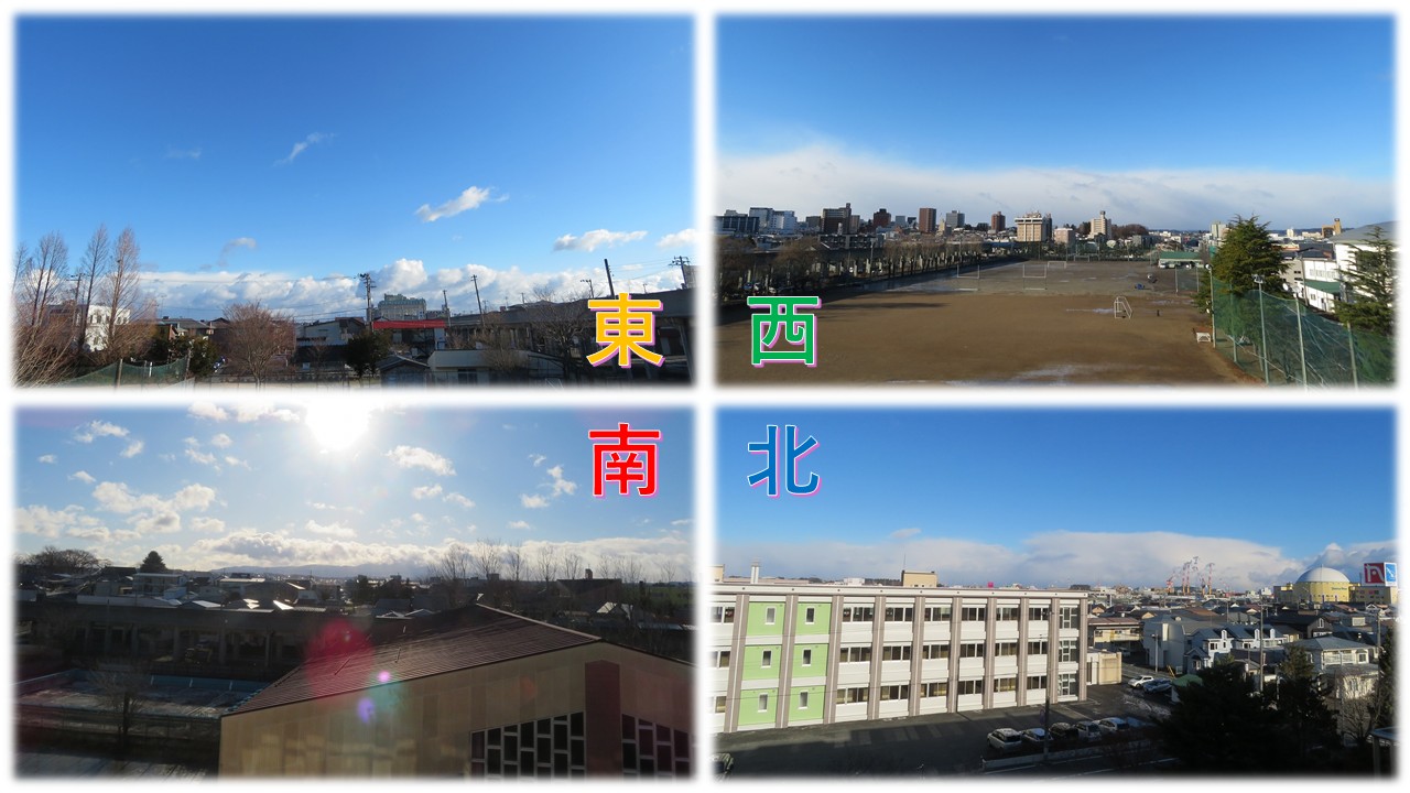校舎から望む、四方の街並みと青空の様子です。