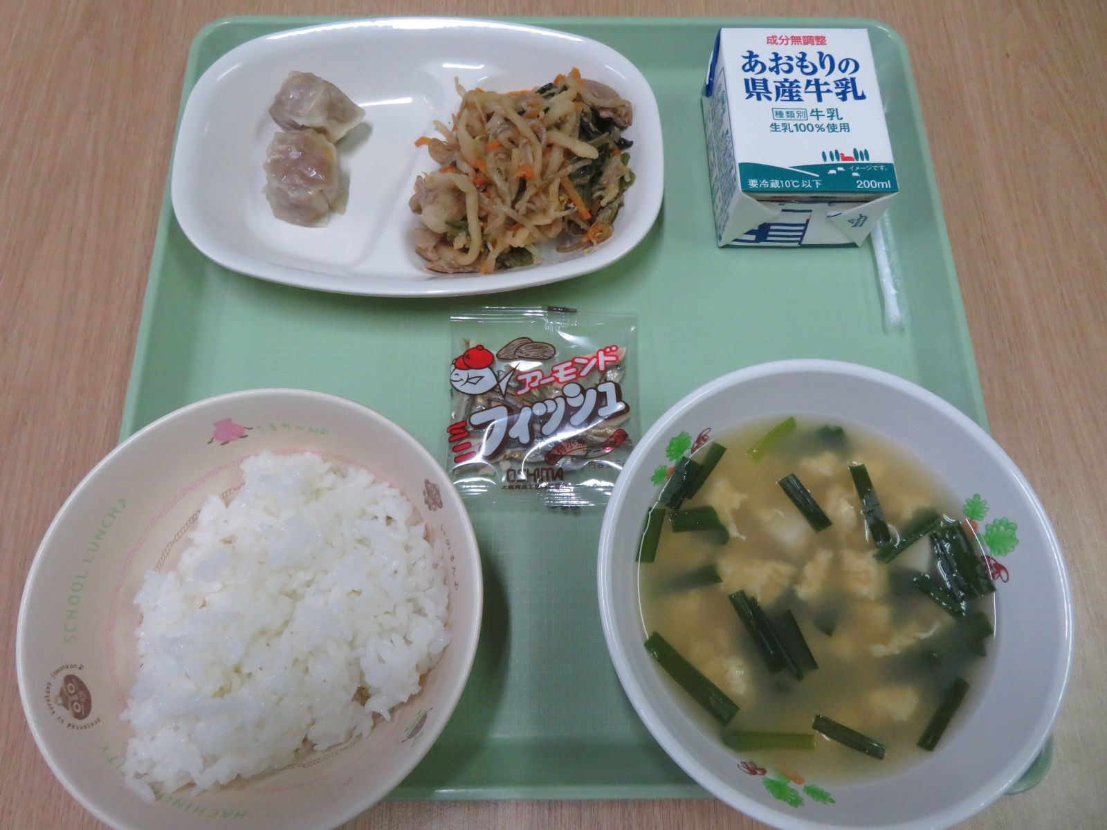 ご飯,牛乳,ニラと卵のスープ,切り干し大根入りビビンバ,コーンシュウマイ,ミニフィッシュアーモンド